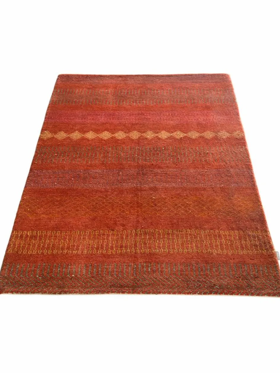 ist eine ungewöhnliche moderne Variation des traditionellen persichen Gabbehs. Er ist kürzer im Flor und feiner geknüpft. Es gibt zahllose Neukreationen in individuellen und einzigartigen Farben und Mustern.| Gesamthöhe: | ca. 10 mm |