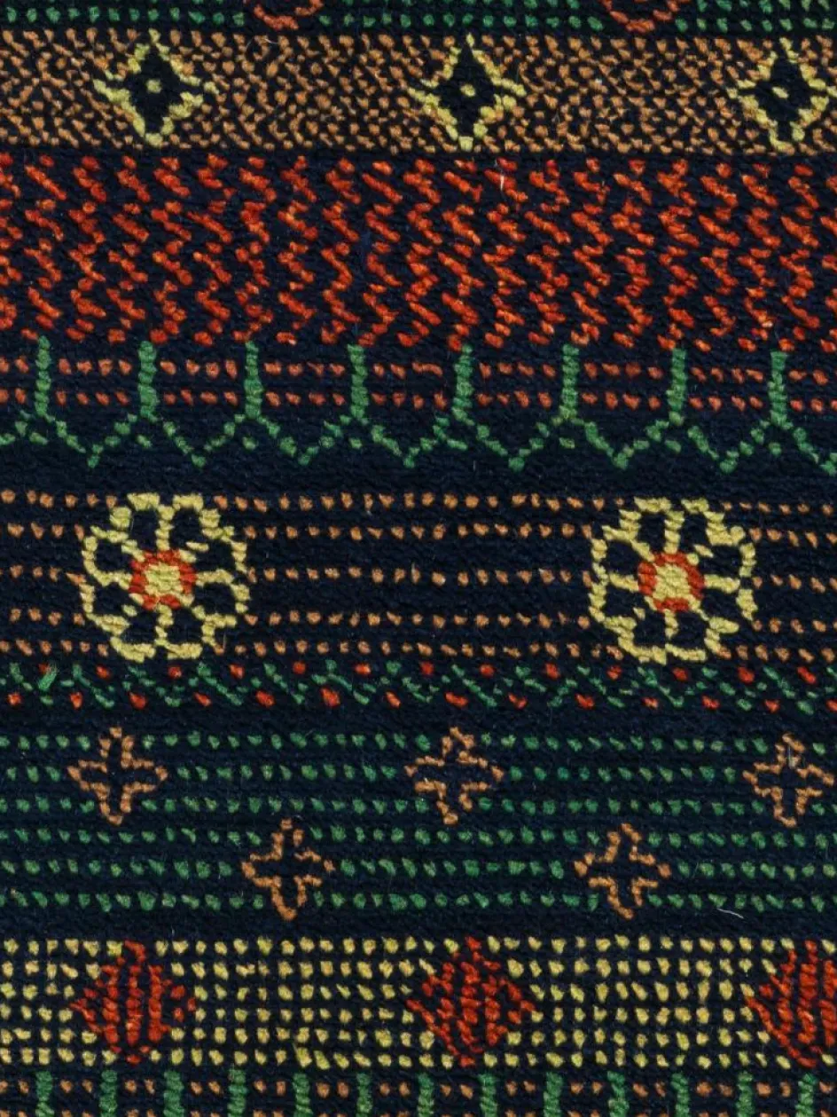 ist eine ungewöhnliche moderne Variation des traditionellen persichen Gabbehs. Er ist kürzer im Flor und feiner geknüpft. Es gibt zahllose Neukreationen in individuellen und einzigartigen Farben und Mustern.| Gesamthöhe: | ca. 10 mm |