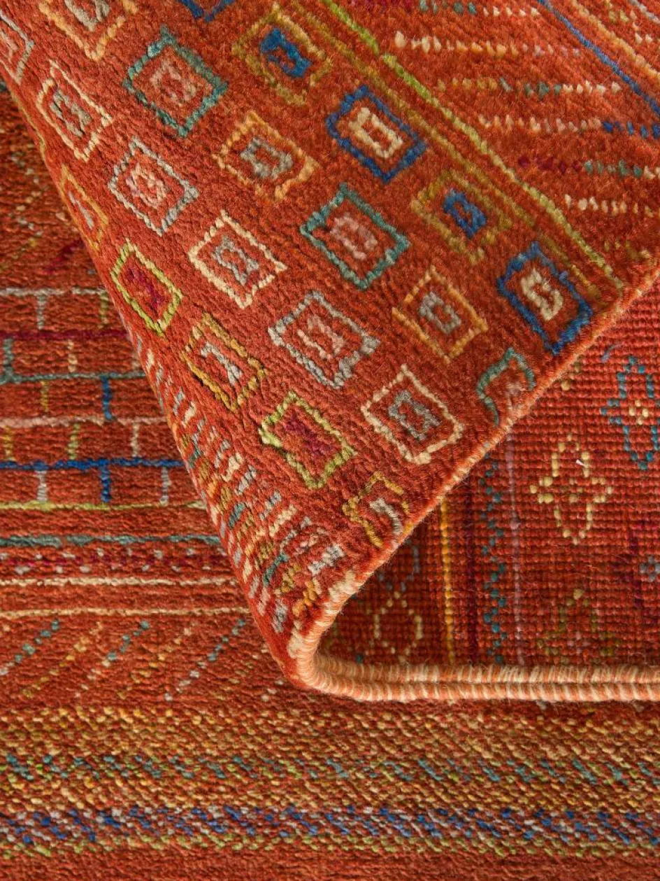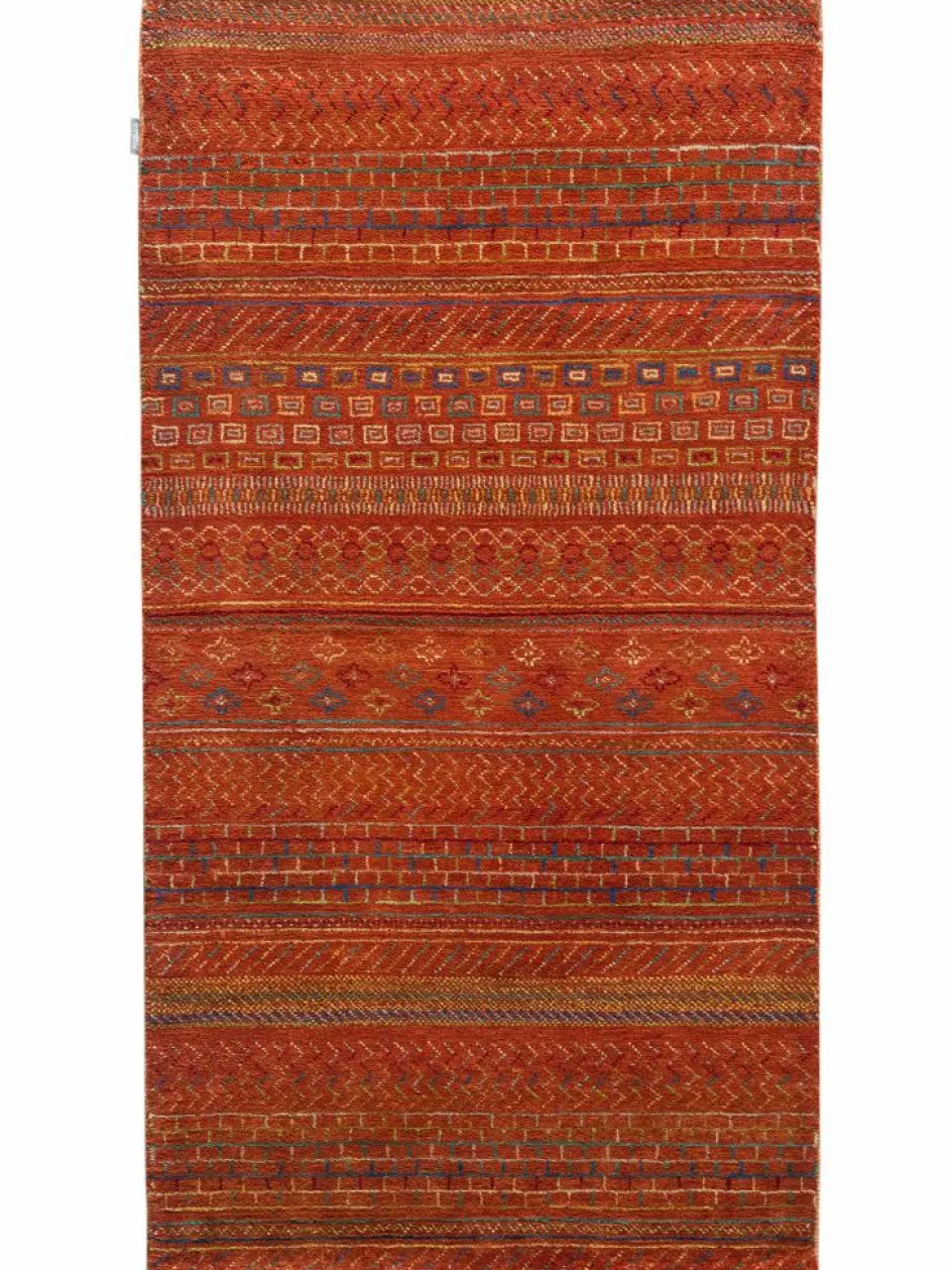 ist eine ungewöhnliche moderne Variation des traditionellen persichen Gabbehs. Er ist kürzer im Flor und feiner geknüpft. Es gibt zahllose Neukreationen in individuellen und einzigartigen Farben und Mustern.| Gesamthöhe: | ca. 10 mm |