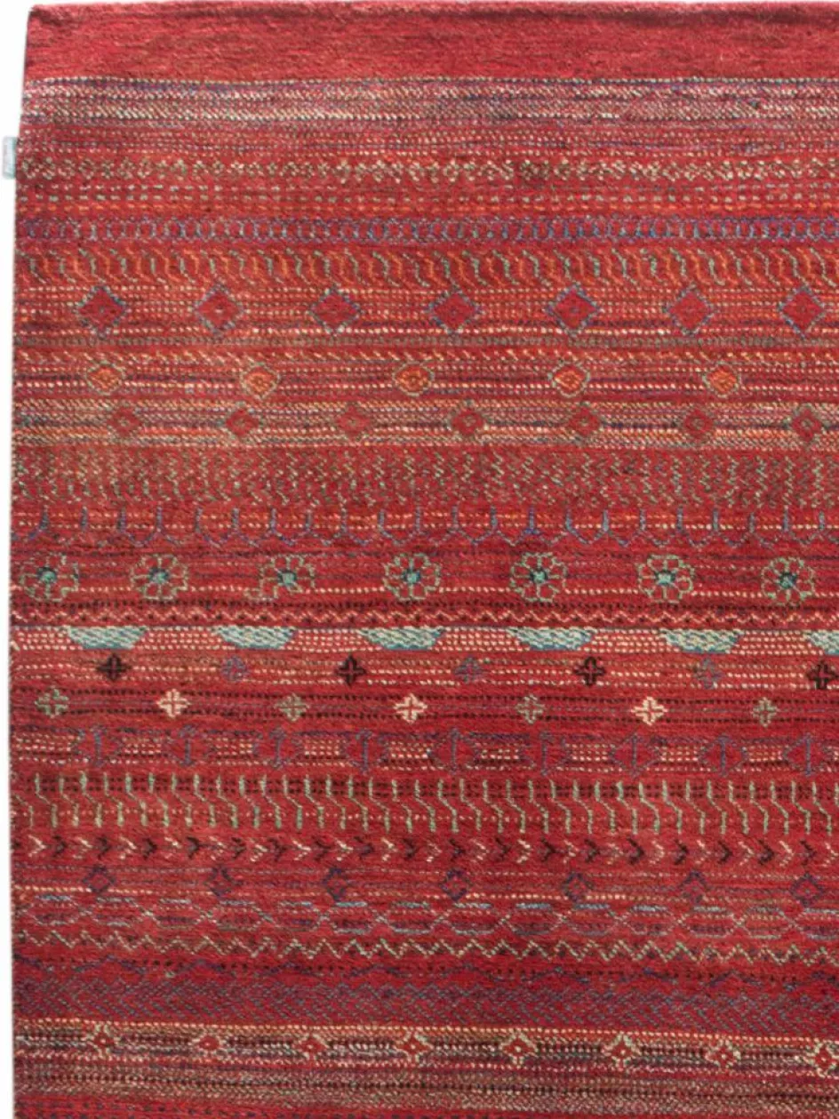 ist eine ungewöhnliche moderne Variation des traditionellen persichen Gabbehs. Er ist kürzer im Flor und feiner geknüpft. Es gibt zahllose Neukreationen in individuellen und einzigartigen Farben und Mustern.| Gesamthöhe: | ca. 10 mm |