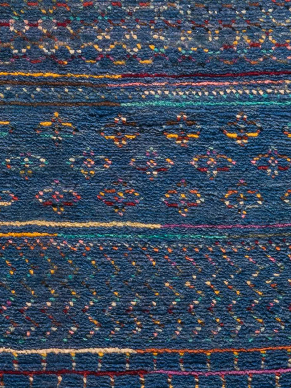 ist eine ungewöhnliche moderne Variation des traditionellen persichen Gabbehs. Er ist kürzer im Flor und feiner geknüpft. Es gibt zahllose Neukreationen in individuellen und einzigartigen Farben und Mustern.| Gesamthöhe: | ca. 10 mm |