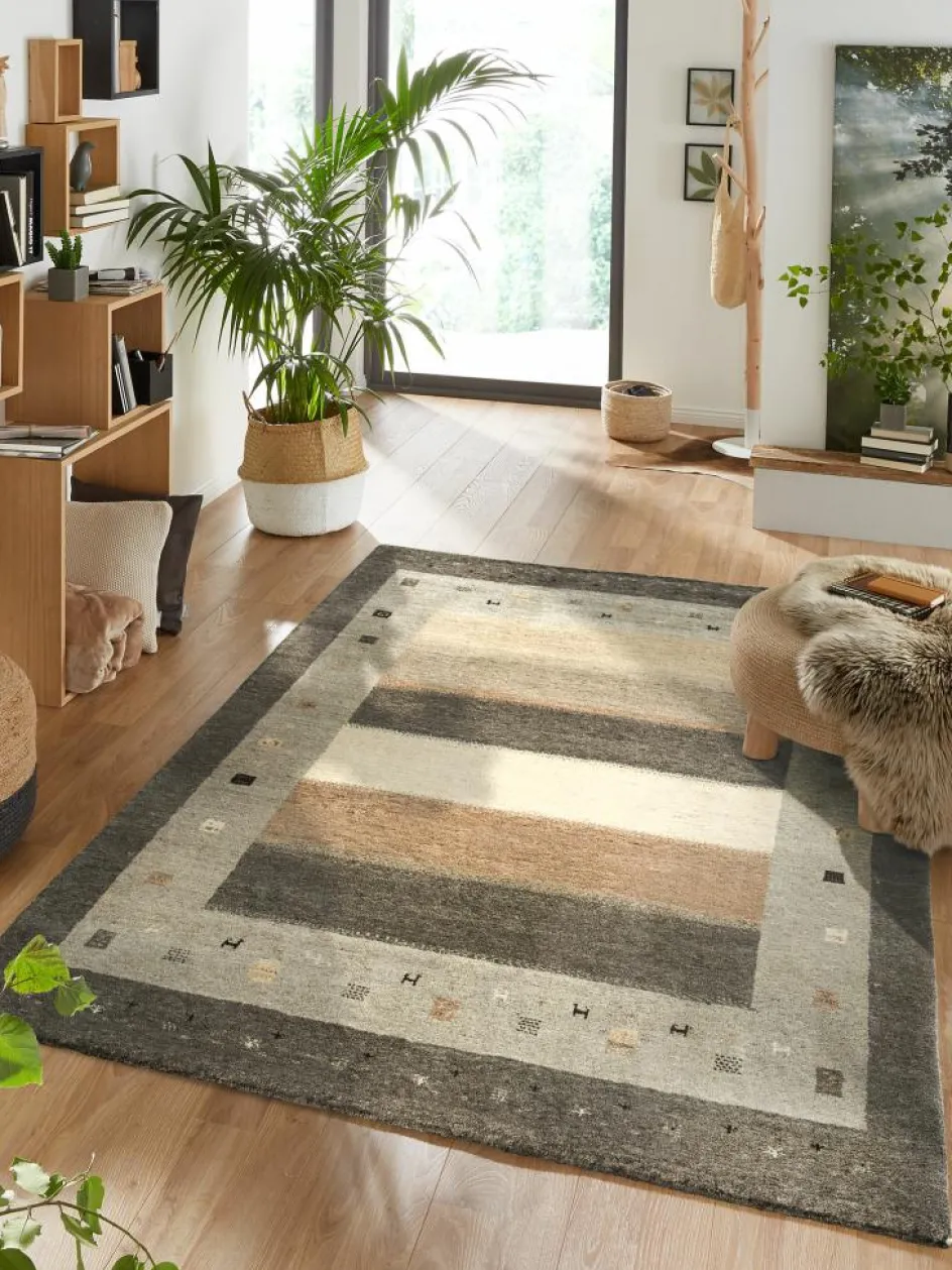 -Teppich ein ganz besonderes Gefühl im Raum aus. Das Teppich Design besteht aus einem modernen Mustermix aus Streifen, mit umliegenden, unterschiedlich gemusterten Bordüren. Hergestellt aus 100 % ungefärbterSchurwolle