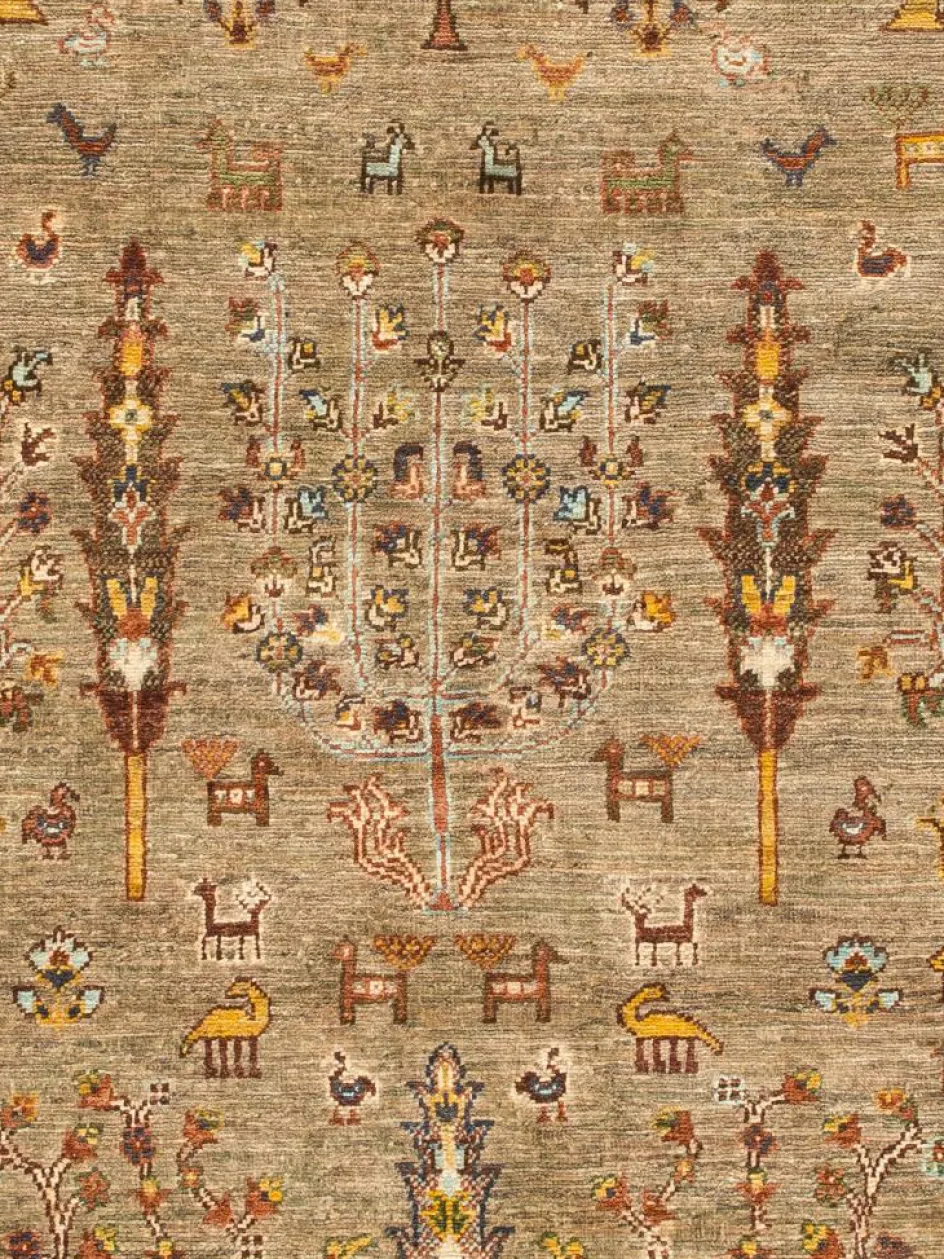 mit Landschaftsmotiven im Stil kaukasischer Teppiche. Das Wort „Gayoon“ kommt aus der Pakistanischen Sprache Urdu und bedeutet „“Landschaft““ oder auch „“Garten““. Durch den flachen und festen Flor ist der Teppich unempfindlich gegenüber den Belastungen des Alltags. – Der Teppich wurde ausGhazni