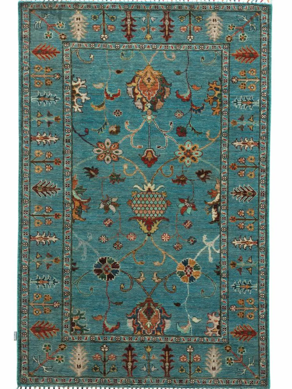 , einem klassischen Blütenmuster. Das Wort „Phool“ kommt aus der Pakistanischen Sprache Urdu und bedeutet „“Blume““. Durch den flachen und festen Flor ist der Teppich unempfindlich gegenüber den Belastungen des Alltags. – Der Teppich wurde ausGhazni
