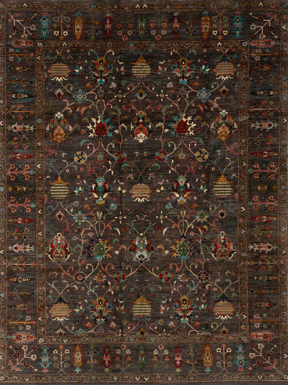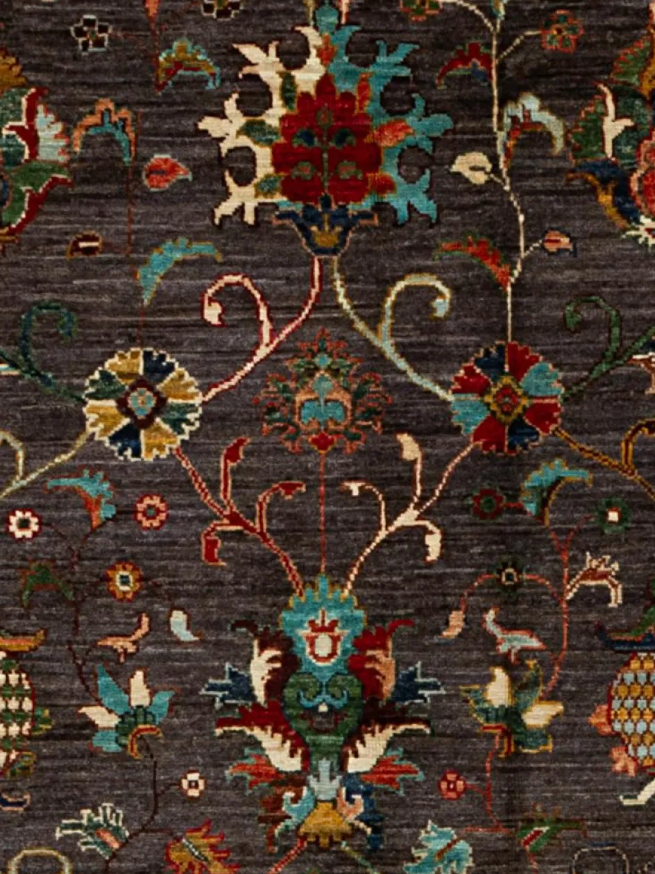 , einem klassischen Blütenmuster. Das Wort „Phool“ kommt aus der Pakistanischen Sprache Urdu und bedeutet „“Blume““. Durch den flachen und festen Flor ist der Teppich unempfindlich gegenüber den Belastungen des Alltags. – Der Teppich wurde ausGhazni