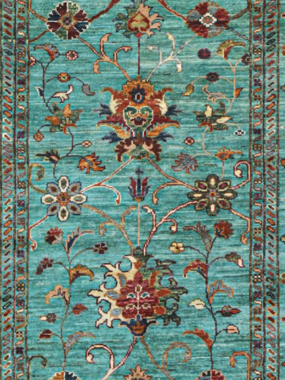 , einem klassischen Blütenmuster. Das Wort „Phool“ kommt aus der Pakistanischen Sprache Urdu und bedeutet „Blume“. Durch den flachen und festen Flor ist der Teppich unempfindlich gegenüber den Belastungen des Alltags. – Der Teppich wurde ausGhazni