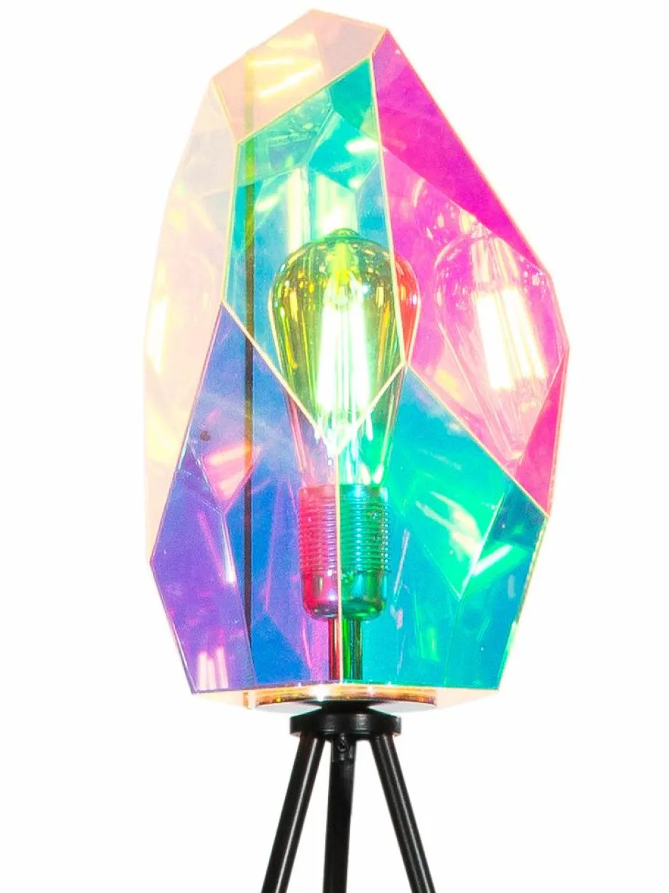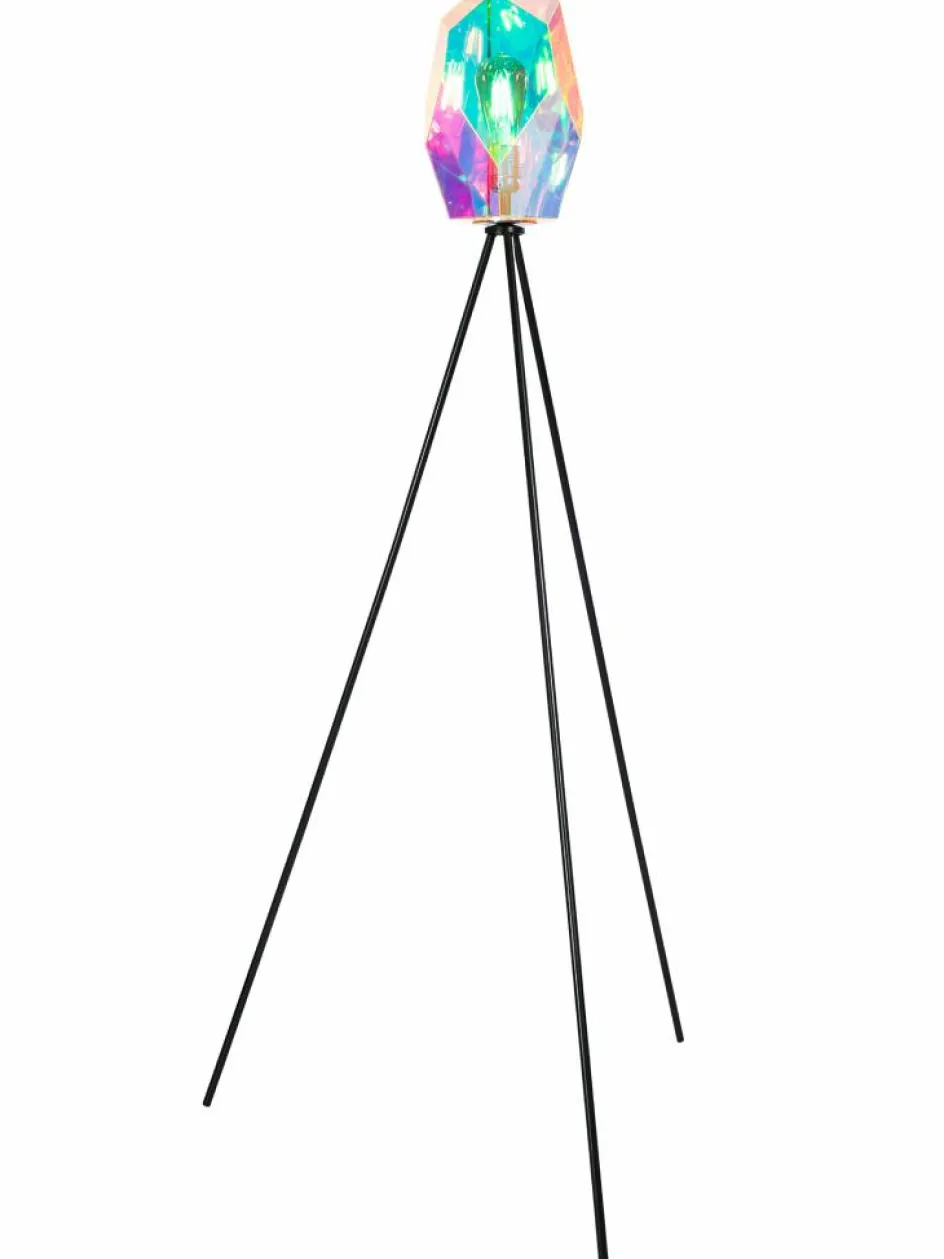 Die Stehlampe hat einen Lampenschirm in wunderschöner Kristallform, welcher das Licht wie ein Prisma streut. Durch das bunt schillernde, transparente Acryl verändert sich die Farbe aus jedem Blickwinkel. Schwarzes Textilkabel mit Kippschalter. Zu verwendende Leuchtmittel (nicht inklusive): E27, max. 4W LED.