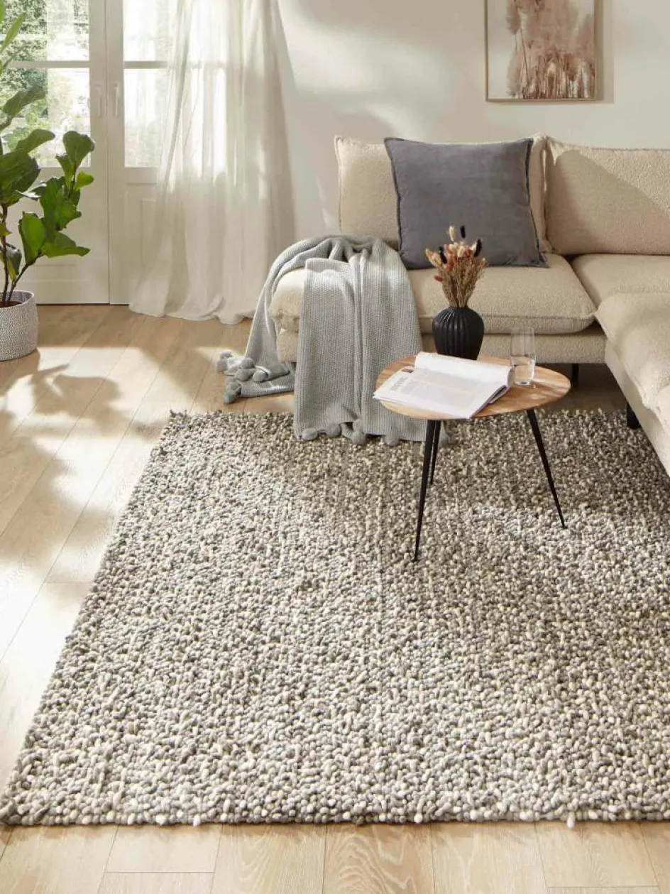 , die vornehmlich aus Neuseeland stammt,wird von Hand in den Teppichgrund des MELBU eingearbeitet. Das natürliche Farbspiel des Garn macht MELBU so einzigartig. DasGrundgewebe
