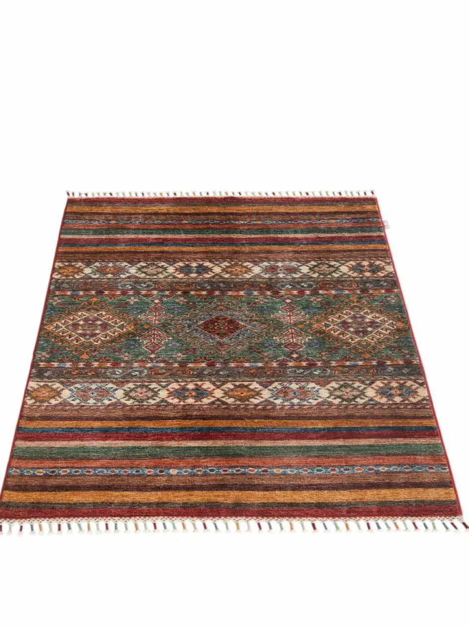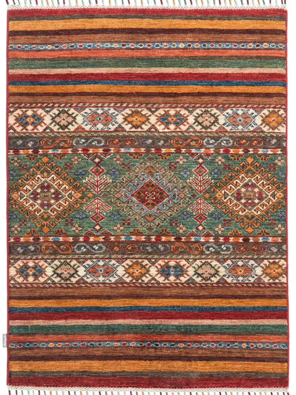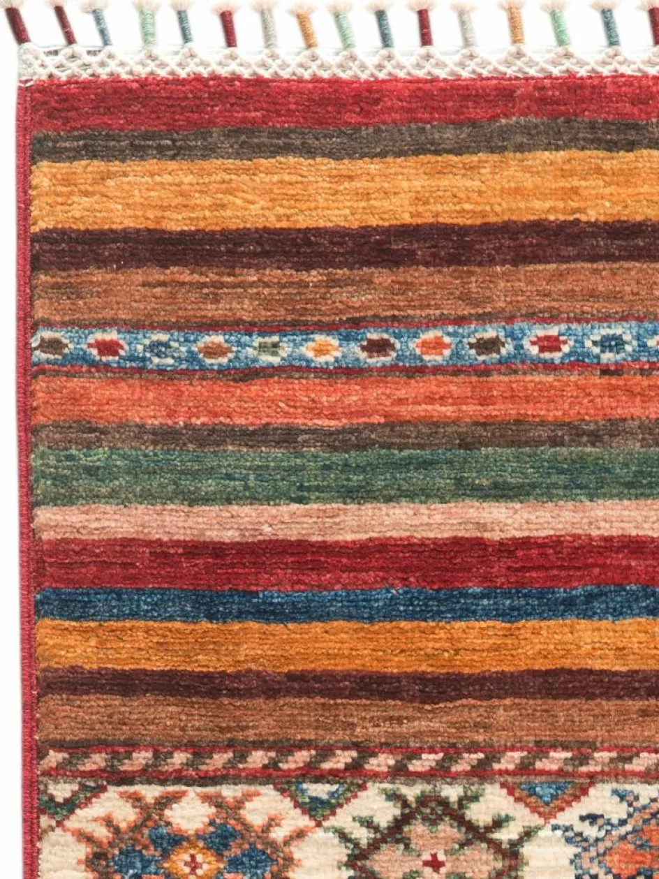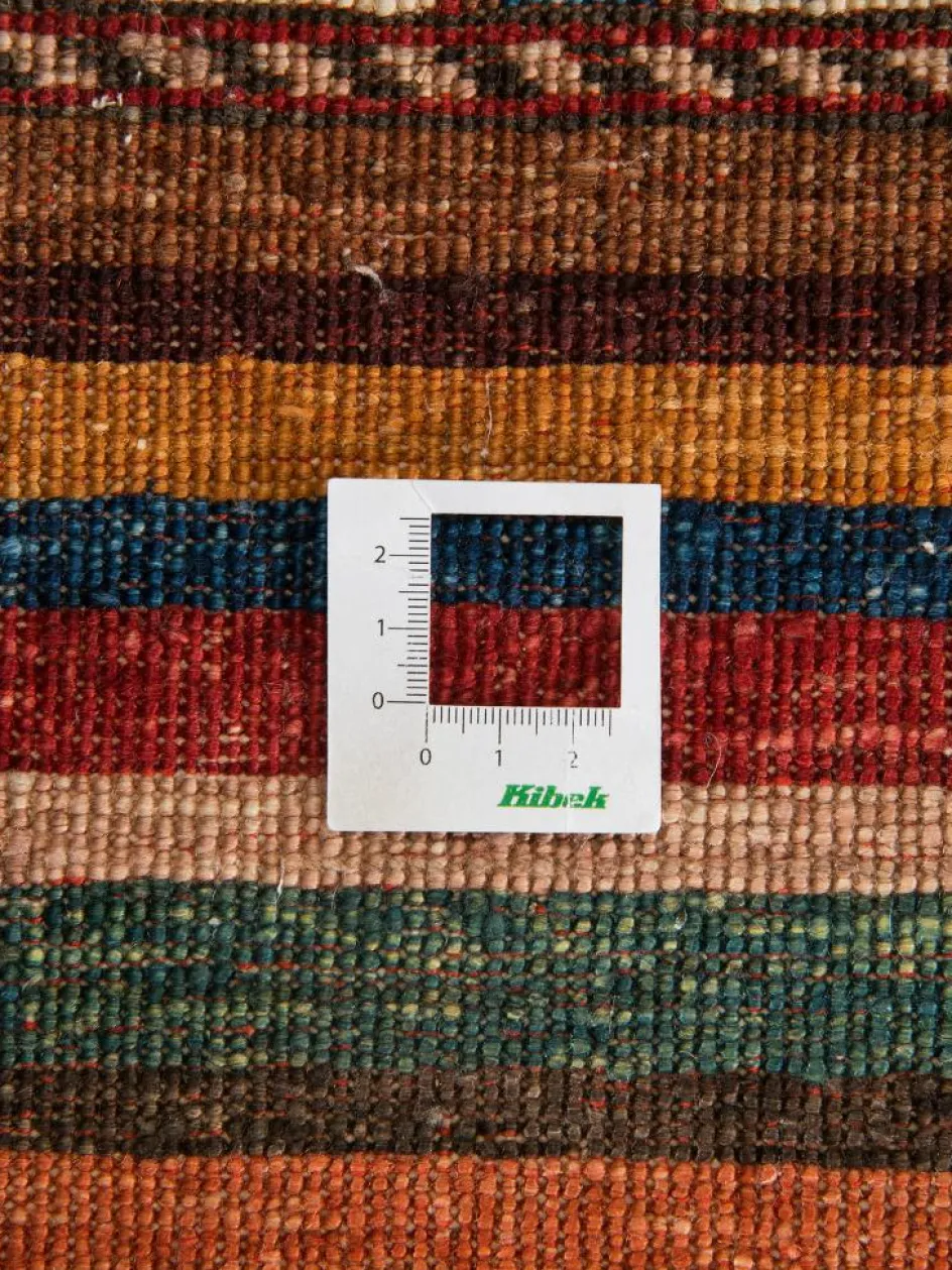 -Muster sind bunte Längsstreifen mit vielen verschiedenen Motiven gefüllt. Durch den flachen und festen Flor ist der Teppich unempfindlich gegenüber den Belastungen des Alltags.- Das Besondere an diesemOrientteppich