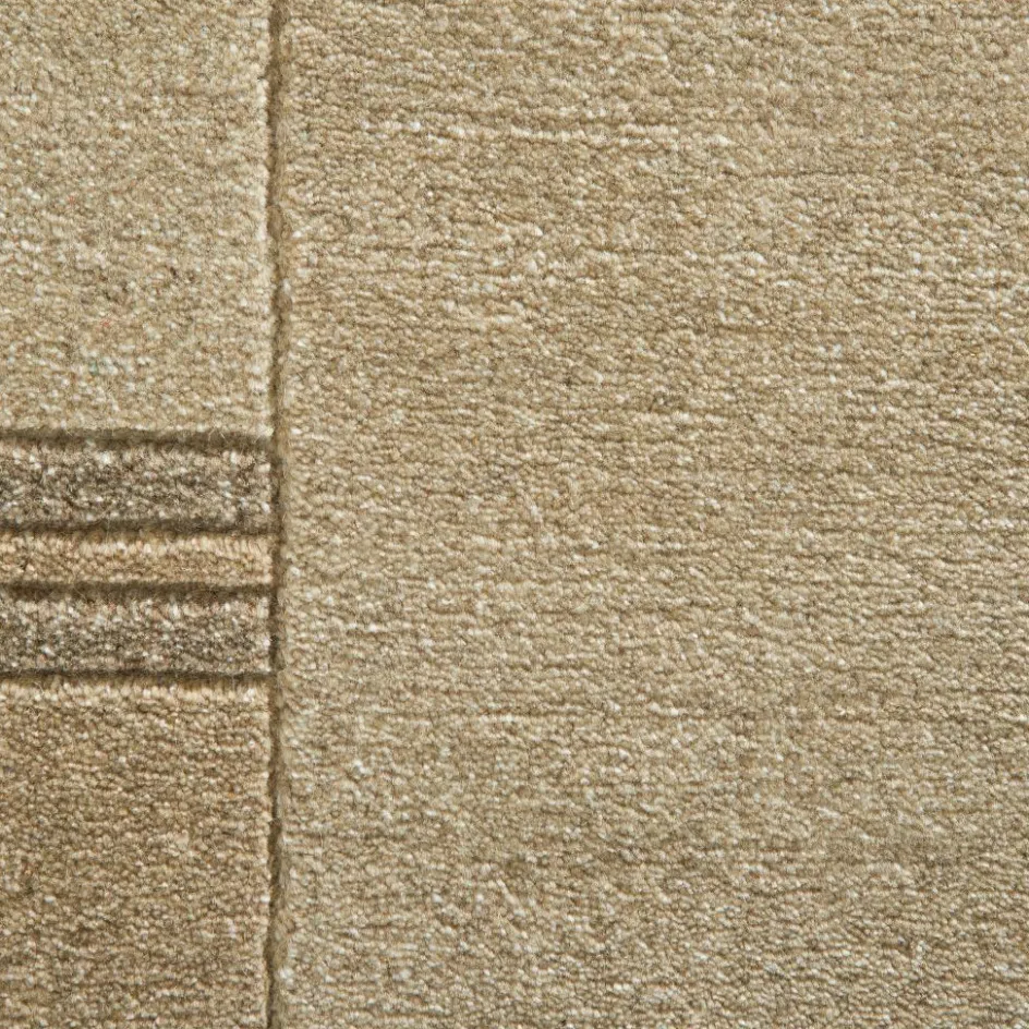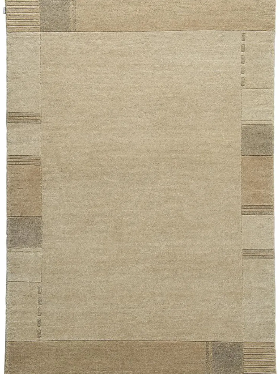 im Flor handgeknüpft. Die Trennung zwischen den Mustern ist akurat ausgearbeitet und von Hand konturgeschnitten. In der Einfassung wurde zur Verstärkung ein Kettfaden eingenäht und anschließend mit farblich passendem Garn ummantelt.| Art: | Nepal -Teppich |