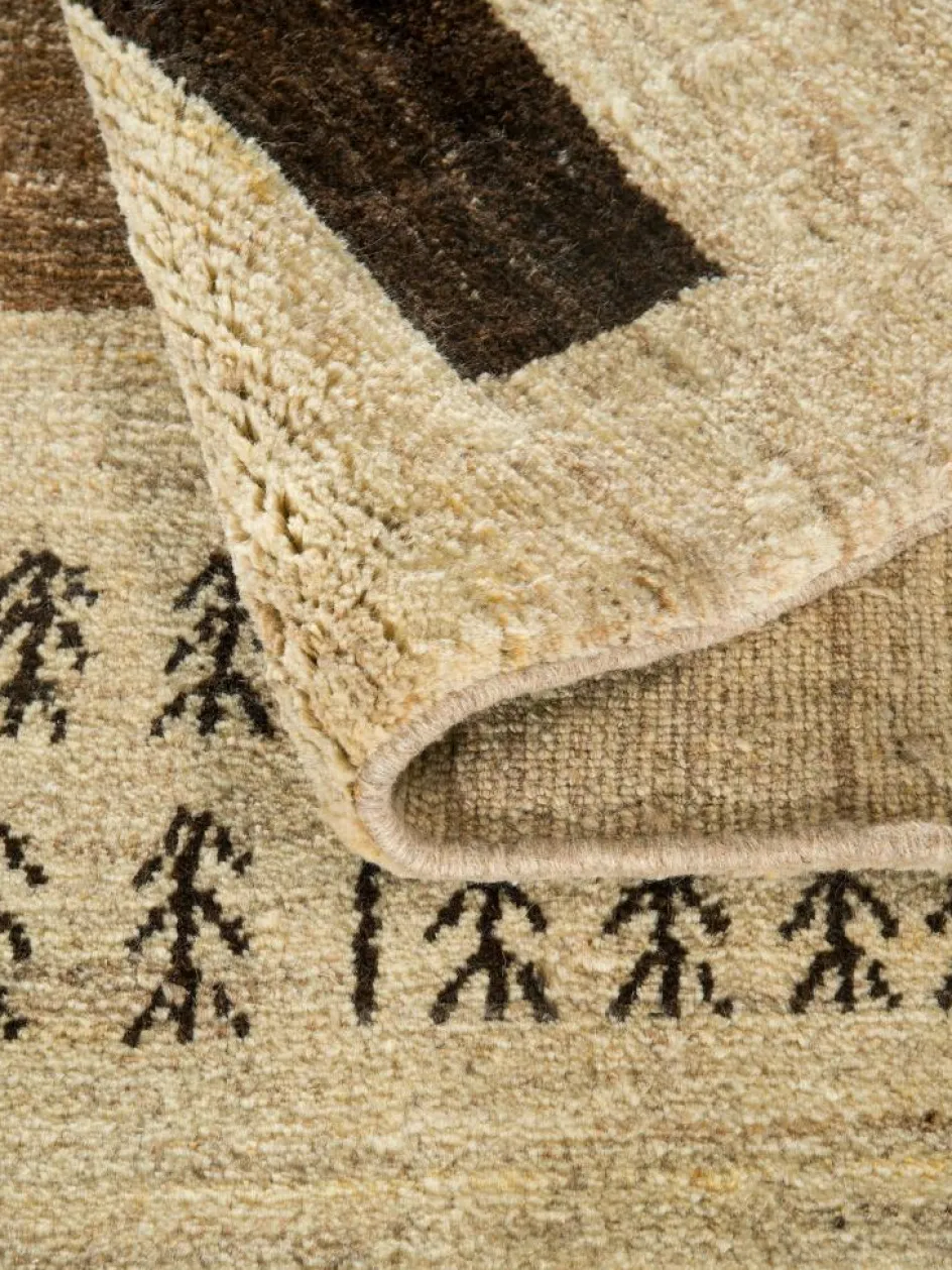 . Die Schur ist relativ hoch, der Griff fest. Die Muster sind meist schlicht oder eine Kombination mit traditionellen Mustern. Mustervorlagen gibt es nicht. Geknüpft werden alle Muster aus dem Kopf.| Gesamthöhe: | ca. 18 mm |
