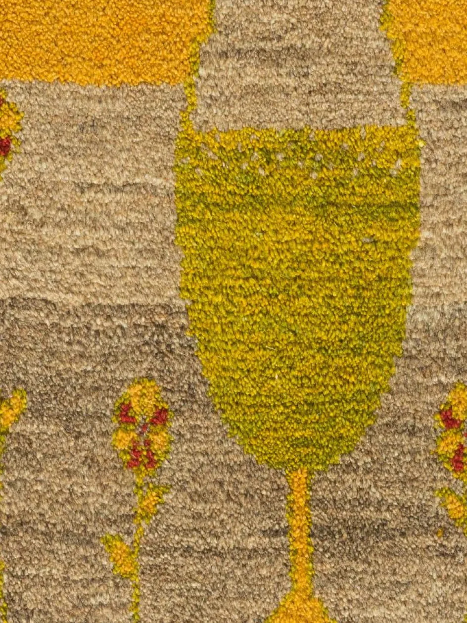 . Die Schur ist relativ hoch, der Griff fest. Die Muster sind meist schlicht oder eine Kombination mit traditionellen Mustern. Mustervorlagen gibt es nicht. Geknüpft werden alle Muster aus dem Kopf.| Gesamthöhe: | ca. 19 mm |