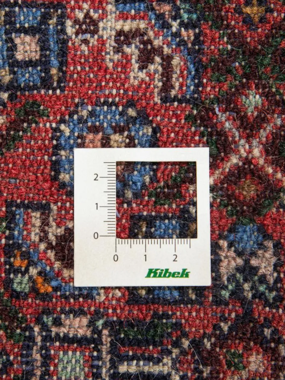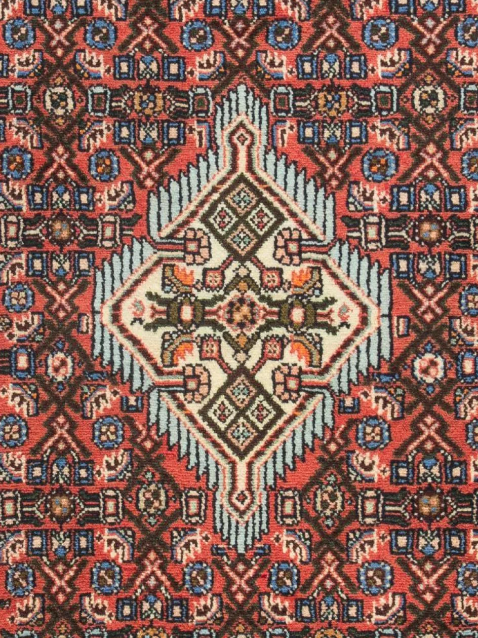 . Die Farben des Teppichs sind warm. Die Muster sind charakteristisch: Das Innenfeld ist mit einemMahi