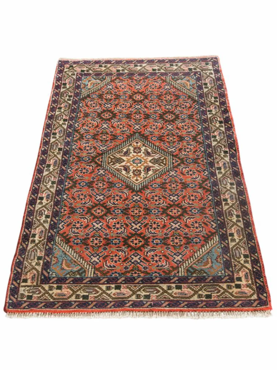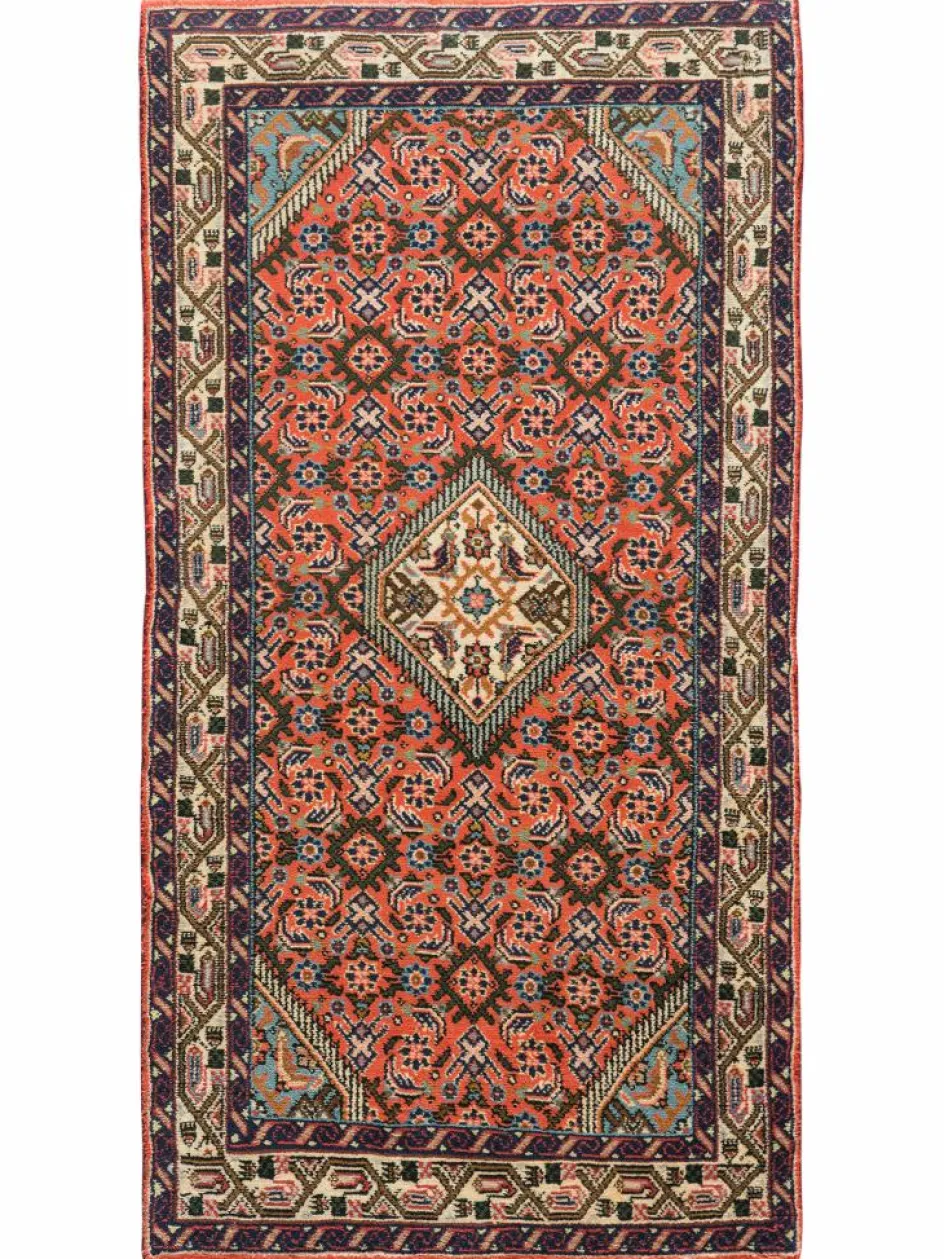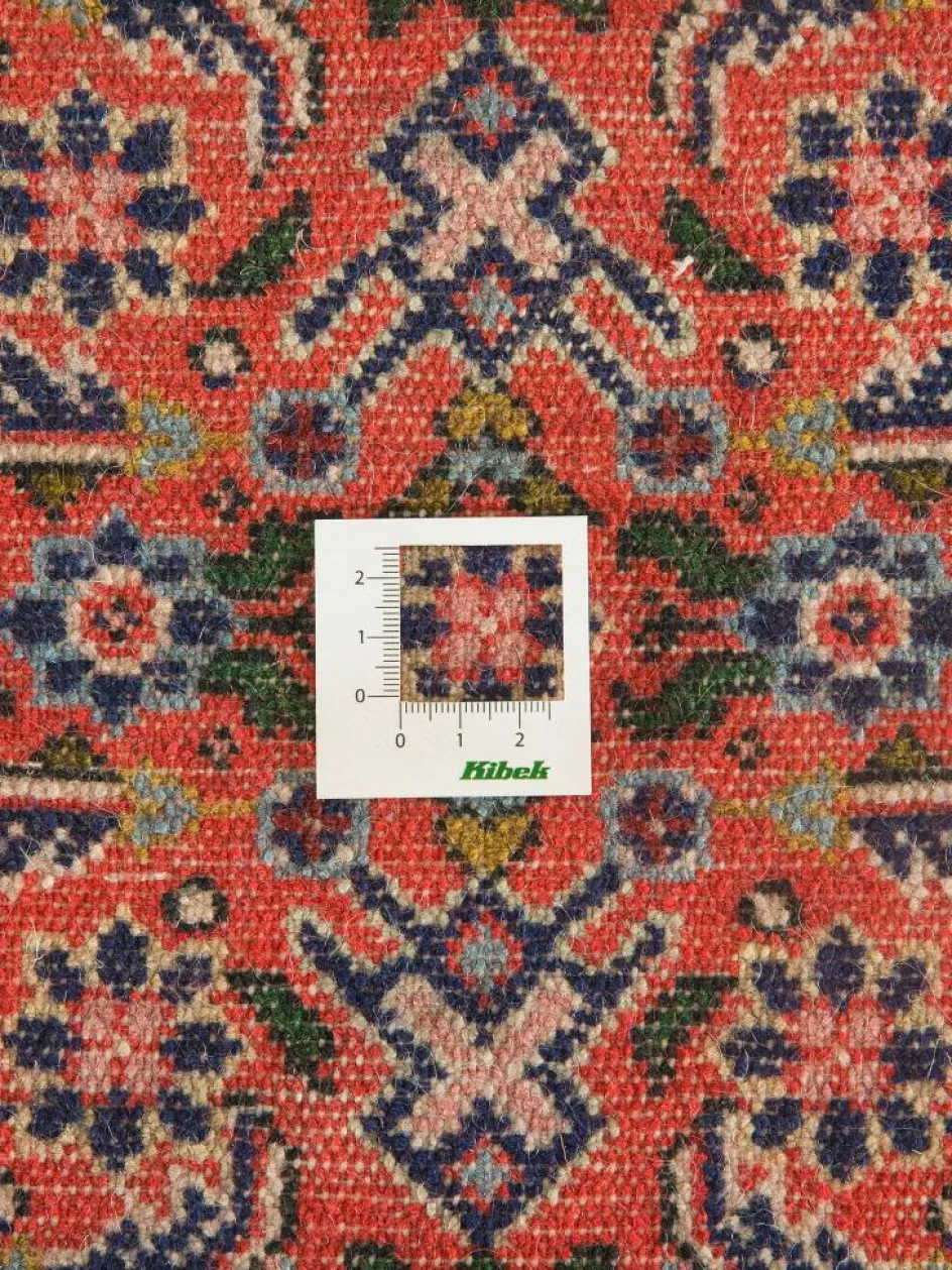 . Die Farben des Teppichs sind warm. Die Muster sind charakteristisch: Das Innenfeld ist mit einemMahi
