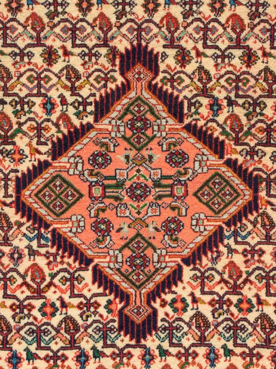 . Die Farben des Teppichs sind warm. Die Muster sind charakteristisch: Das Innenfeld ist mit einemMahi