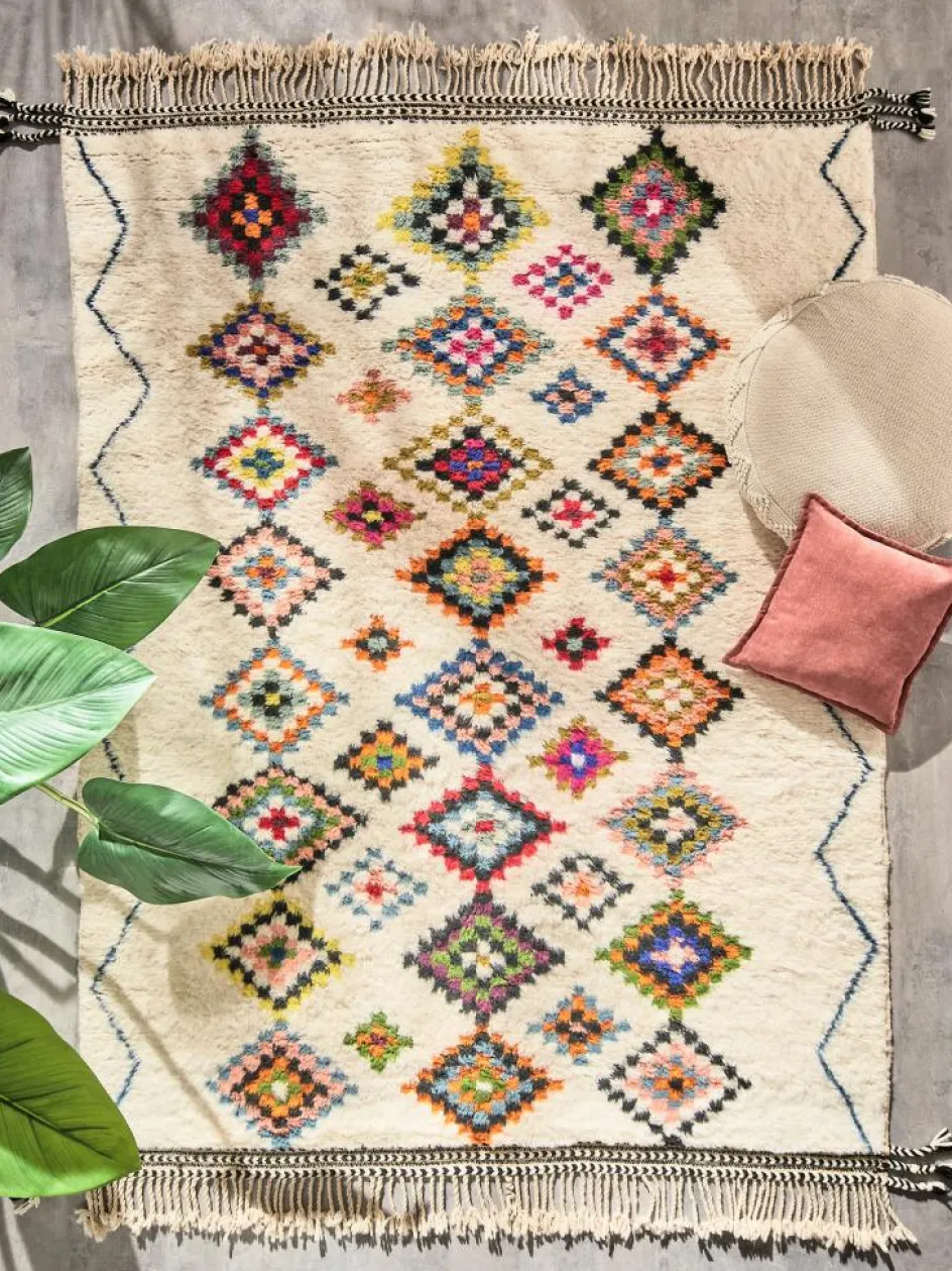 aus von Hand gearbeiteter Schafwolle. Eine aufwändig gestaltete Webkante mit hochwertigen Wollfransen rundet diesen Teppich ab.Azilal