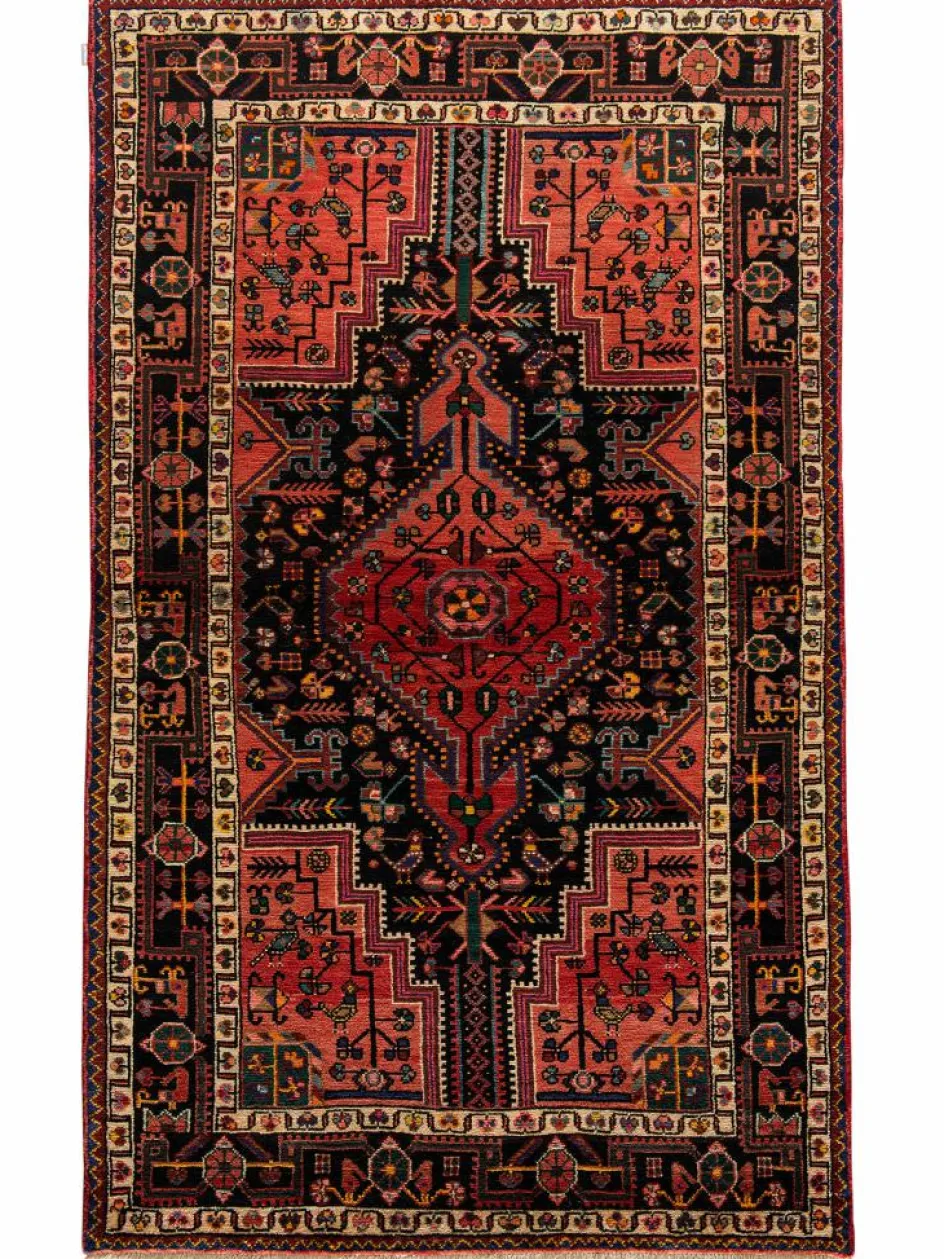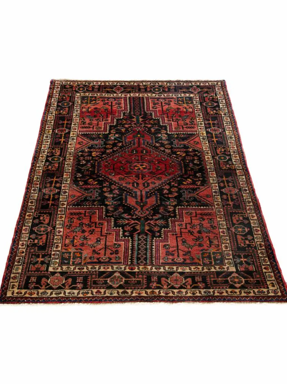 -Gebiets. Hier werden robuste Teppiche geknüpft. Charakteristisch ist ein beigefarbener oder schwarzer Grund, wenig gemustert, von dem sich das typische hexagonale Mittelmedaillon stark abhebt.- Die Gegend umHamadan