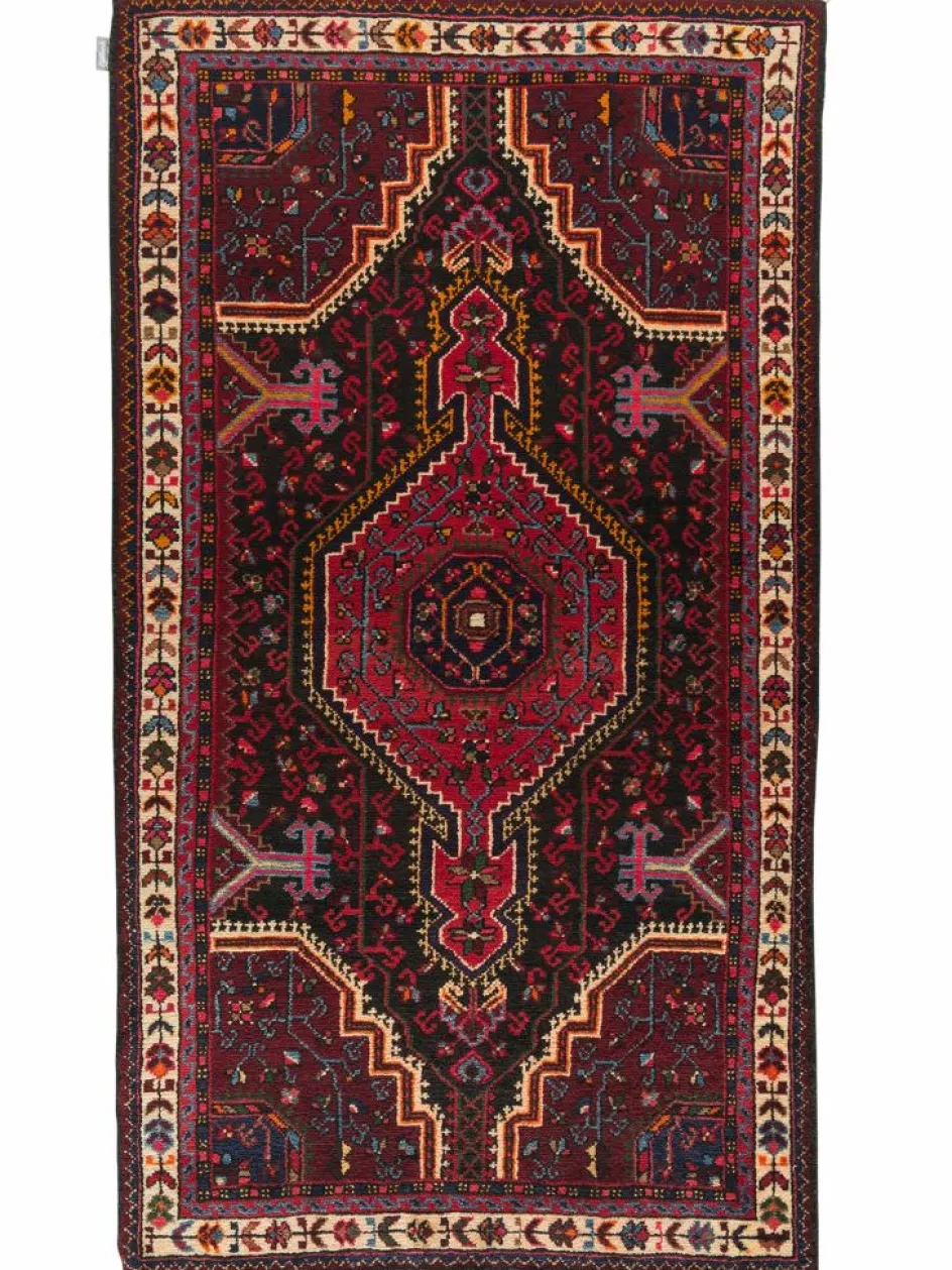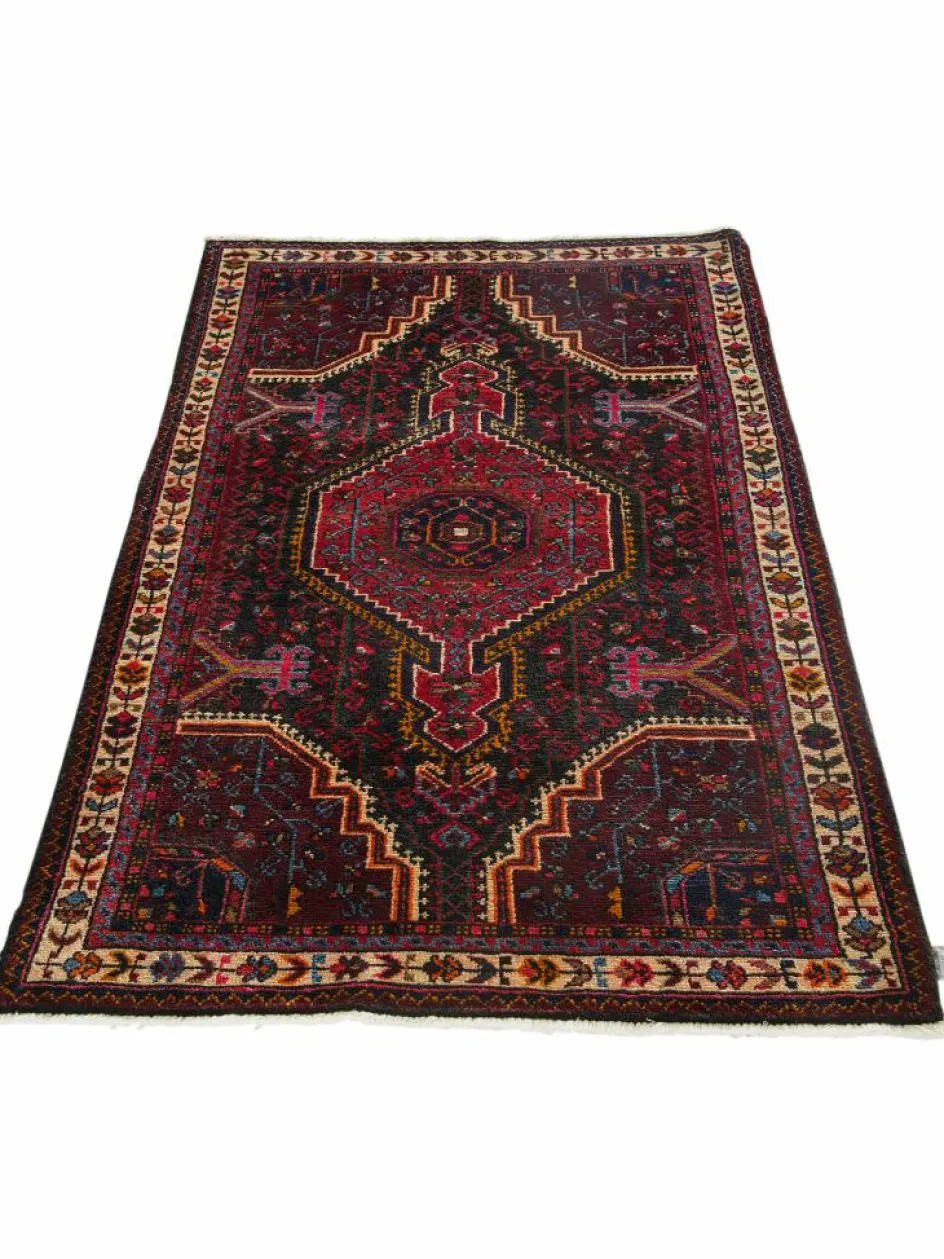 -Gebiets. Hier werden robuste Teppiche geknüpft. Charakteristisch ist ein beigefarbener oder schwarzer Grund, wenig gemustert, von dem sich das typische hexagonale Mittelmedaillon stark abhebt.- Die Gegend umHamadan