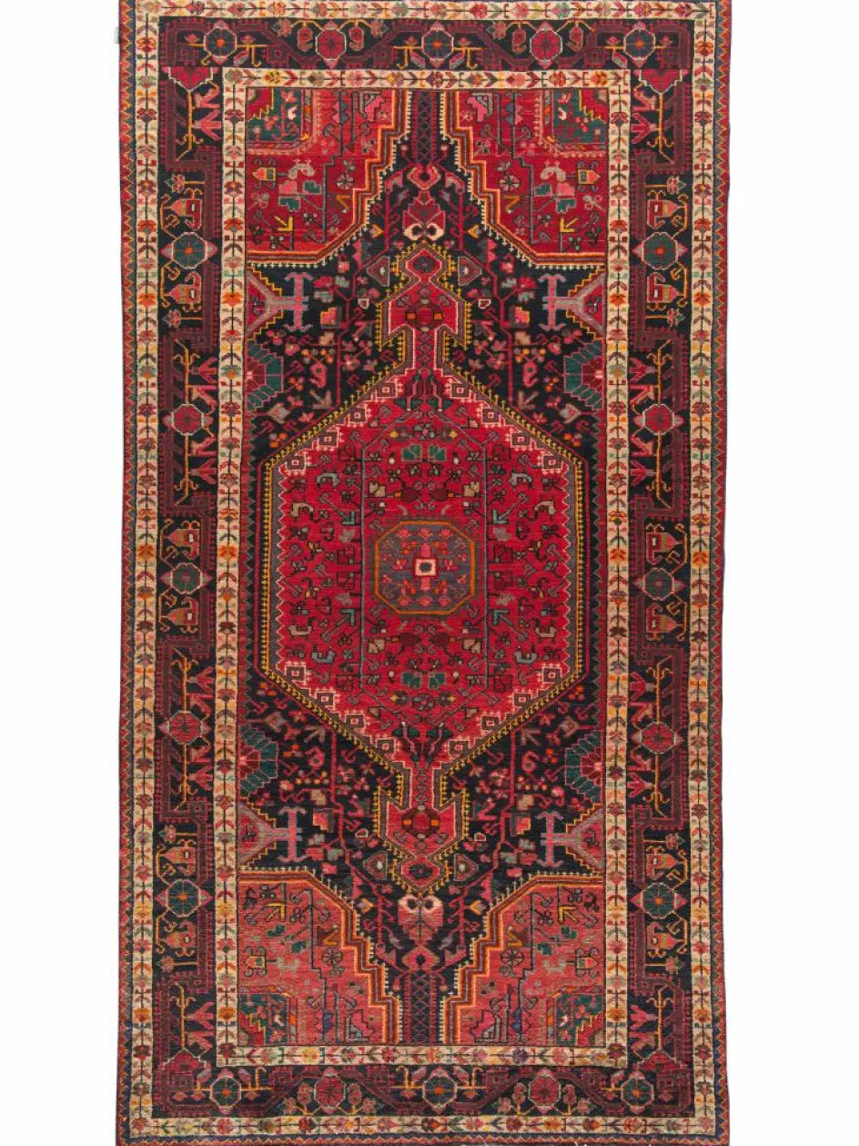 -Gebiets. Hier werden robuste Teppiche geknüpft. Charakteristisch ist ein beigefarbener oder schwarzer Grund, wenig gemustert, von dem sich das typische hexagonale Mittelmedaillon stark abhebt.- Die Gegend umHamadan