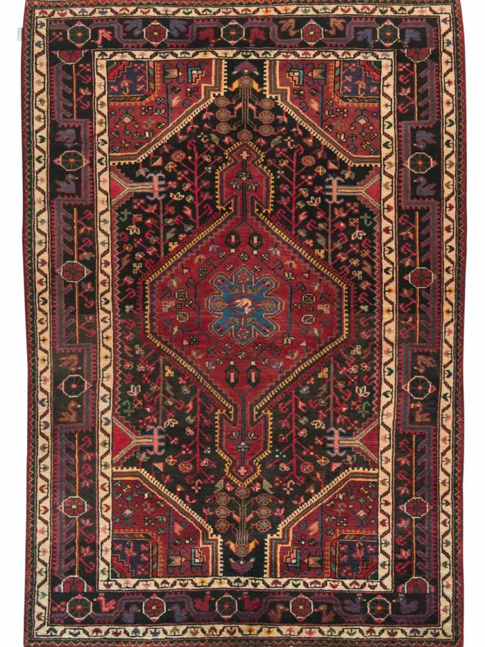 -Gebiets. Hier werden robuste Teppiche geknüpft. Charakteristisch ist ein beigefarbener oder schwarzer Grund, wenig gemustert, von dem sich das typische hexagonale Mittelmedaillon stark abhebt.- Die Gegend umHamadan