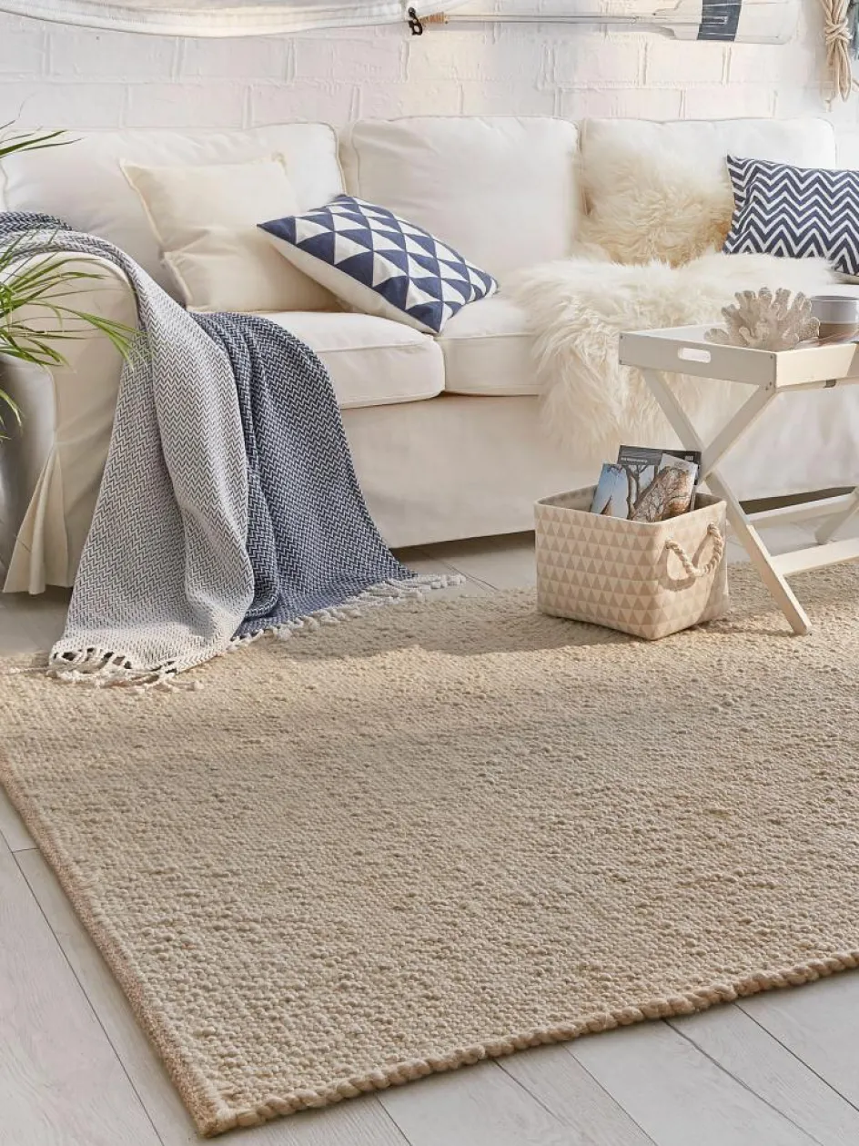 aus Neuseeland im Obergewebe und das stolze Gesamtgewicht von ca. 2.850 g pro m² überzeugen in puncto Belastbarkeit und langer Lebensdauer. Praktischer Weise ist dieser Naturfaser-Teppich beidseitig verwendbar. Zu diesem Handwebteppich empfehlen wir zur Sicherheit auf Schritt und Tritt die KIBEK ALLSTOP-SUPER Teppich-Spezialunterlage. Teppiche ausSchurwolle
