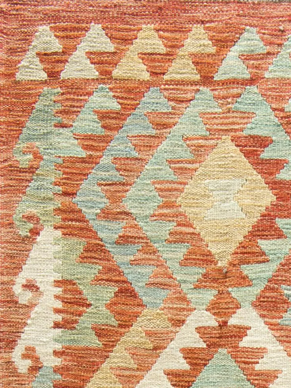 gehört zu den Schlitzkelims. Beim Schlitzkelim entsteht das Muster durch das farbige Schussmaterial, das bei einem Farbwechsel wieder zurück geführt wird. Dadurch entsteht ein sichtbarer Schlitz. Die Fadenenden werden eingearbeitet und sind nicht zu sehen. Durch diese Webart ist der AfghanKelim