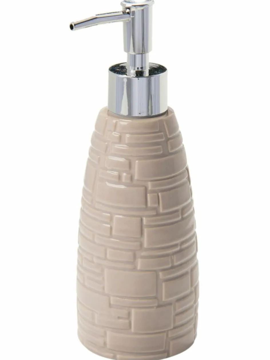 Badserie aus Keramik. Spenderaufsatz beim Seifenspender aus Kunststoff. Lieferung ohne Inhalt.