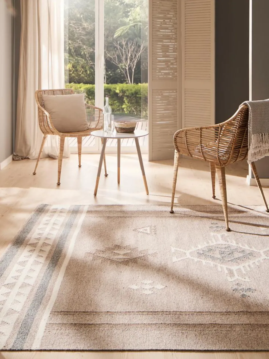, Polyester und Baumwolle bietet Berga nicht nur ein angenehmes Laufgefühl, sondern auch eine strapazierfähige und pflegeleichte Oberfläche. Seine ethnischen Muster in harmonischen Farben verleihen jedem Raum Wärme, während er gleichzeitig für eine gemütliche Atmosphäre sorgt. Teppiche mit Schurwoll-Anteil können einen typischen Eigengeruch haben. Bei regelmäßigem Lüften verfliegt dieser Geruch nach einigen Tagen.| Eigenschaften: | für Fußbodenheizung geeignet |