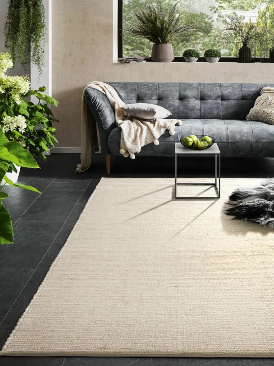 Luftfeuchtigkeit aufnimmt und bei trockener Raumluft wieder abgibt. Der strapazierfähige Handwebteppich aus 60 % Neuseeland-Schurwolle