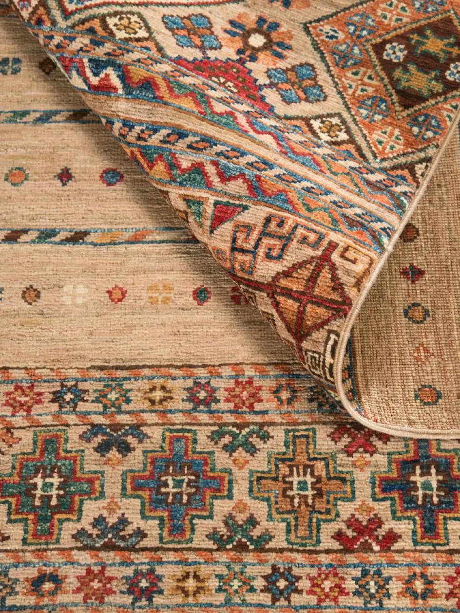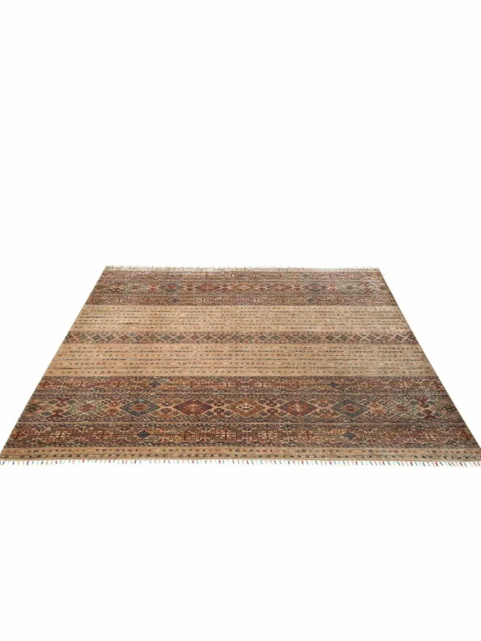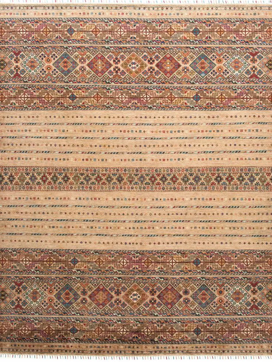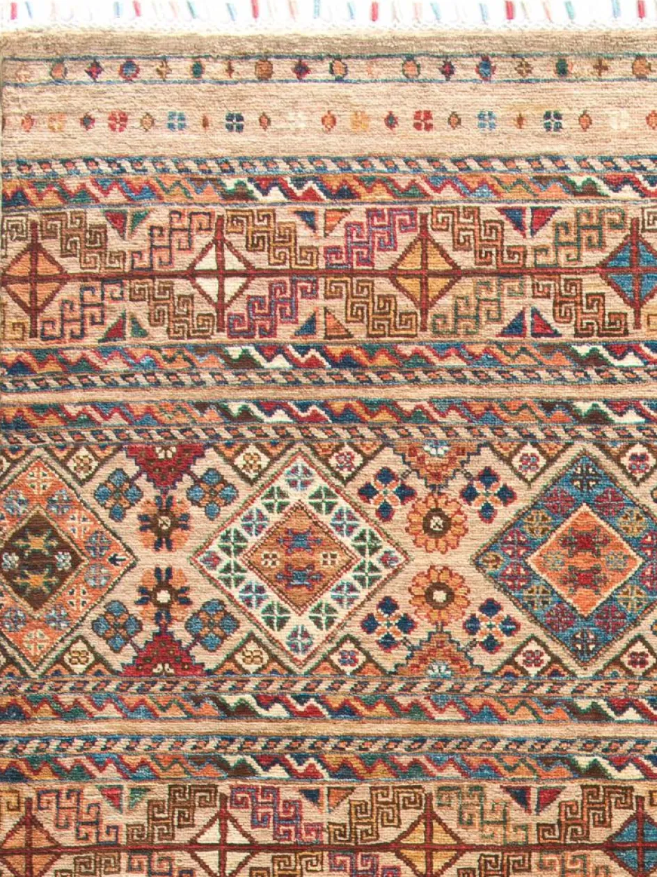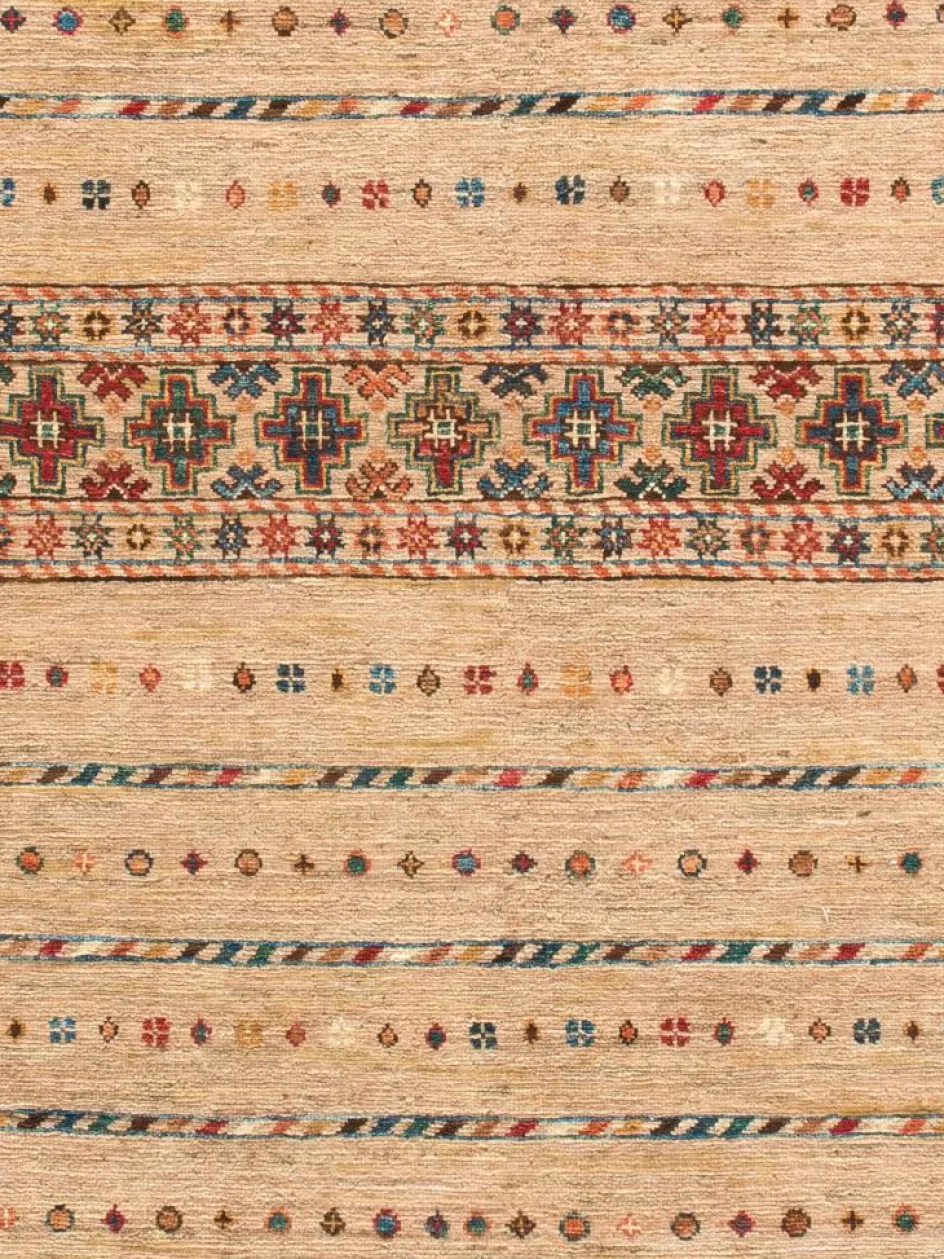 -Muster sind bunte Längsstreifen mit vielen verschiedenen Motiven gefüllt. Durch den flachen und festen Flor ist der Teppich unempfindlich gegenüber den Belastungen des Alltags.- Das Besondere an diesemOrientteppich