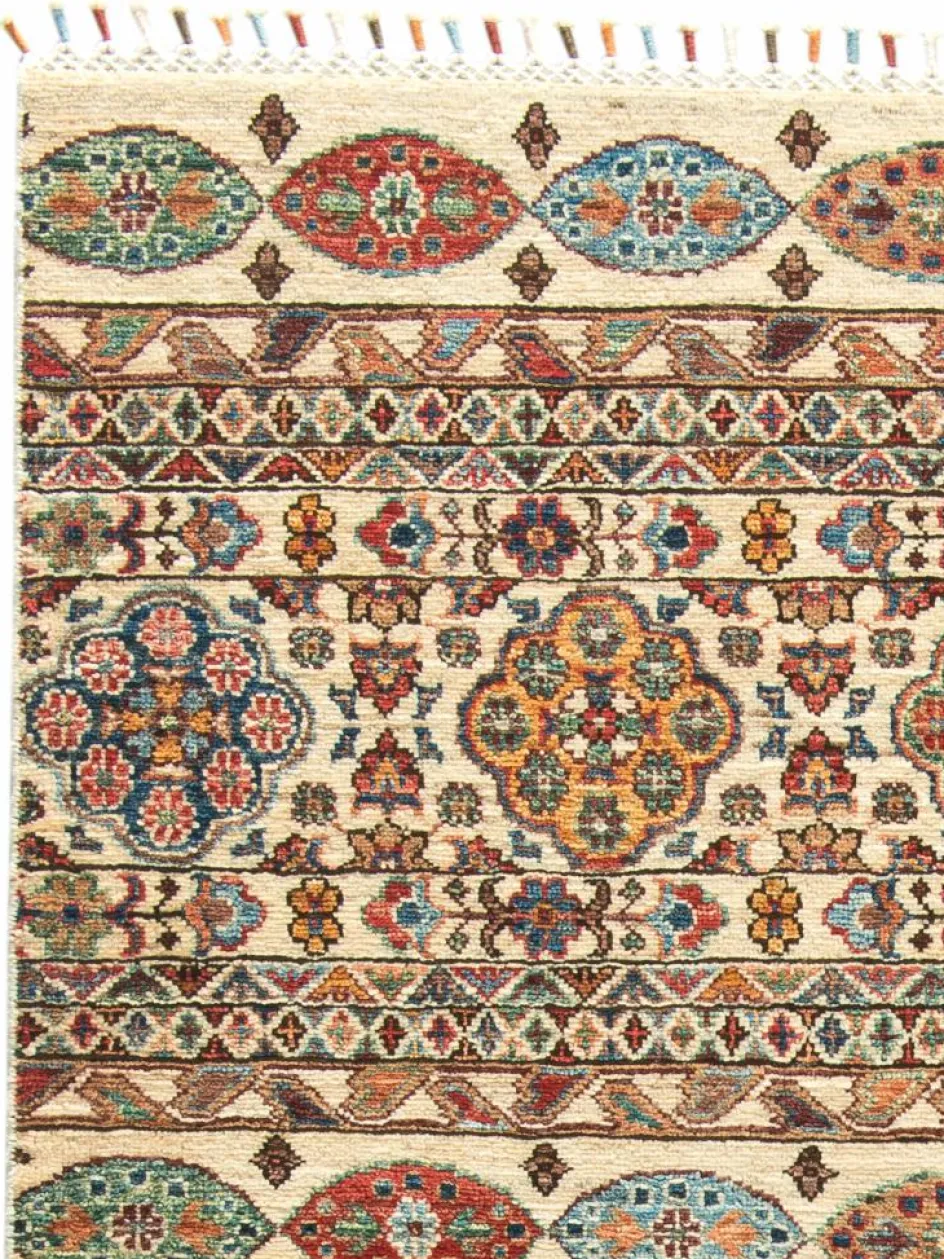 -Muster sind bunte Längsstreifen mit vielen verschiedenen Motiven gefüllt. Durch den flachen und festen Flor ist der Teppich unempfindlich gegenüber den Belastungen des Alltags.- Das Besondere an diesemOrientteppich