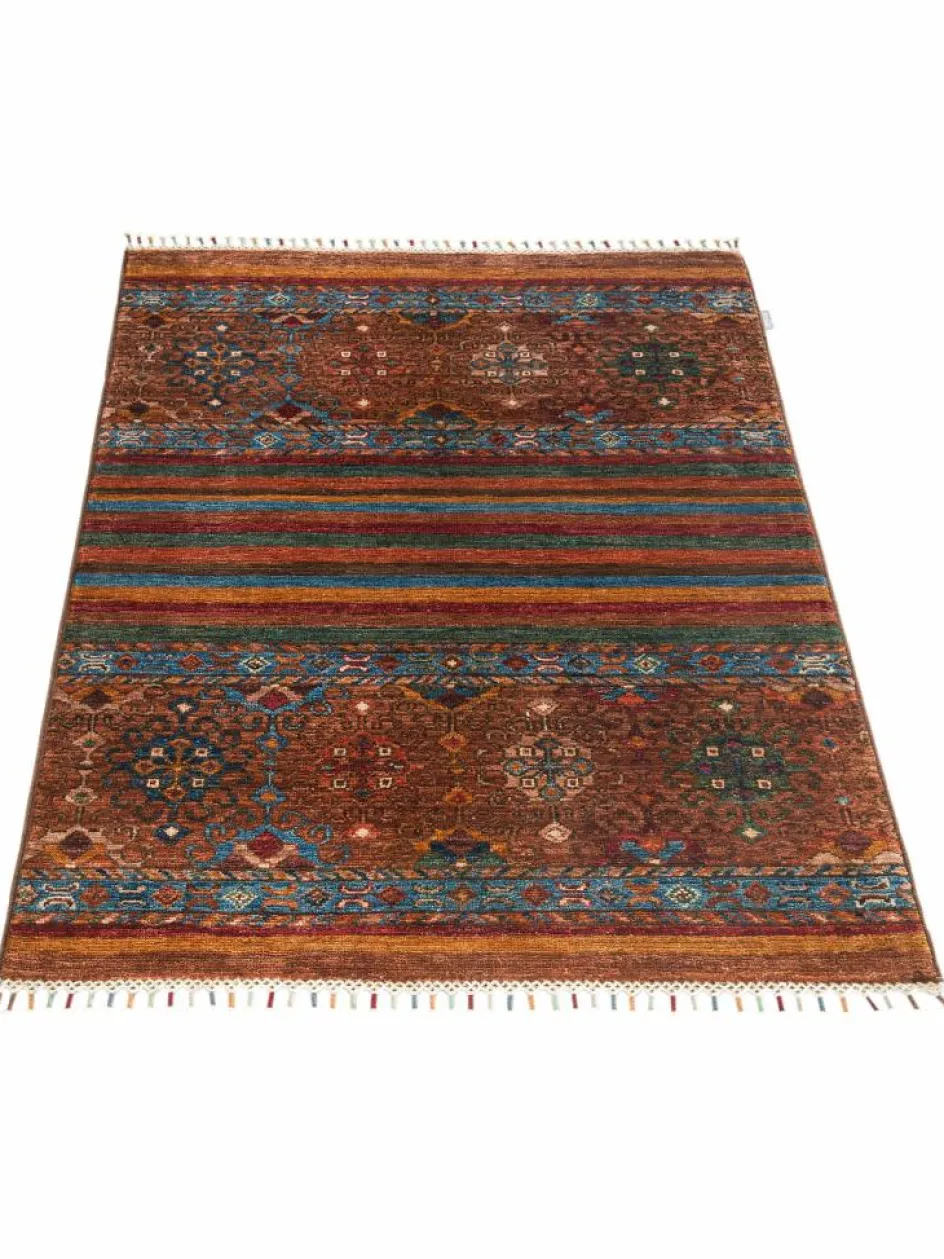 -Muster sind bunte Längsstreifen mit vielen verschiedenen Motiven gefüllt. Durch den flachen und festen Flor ist der Teppich unempfindlich gegenüber den Belastungen des Alltags.- Das Besondere an diesemOrientteppich