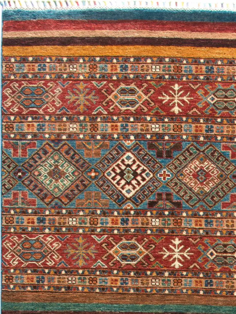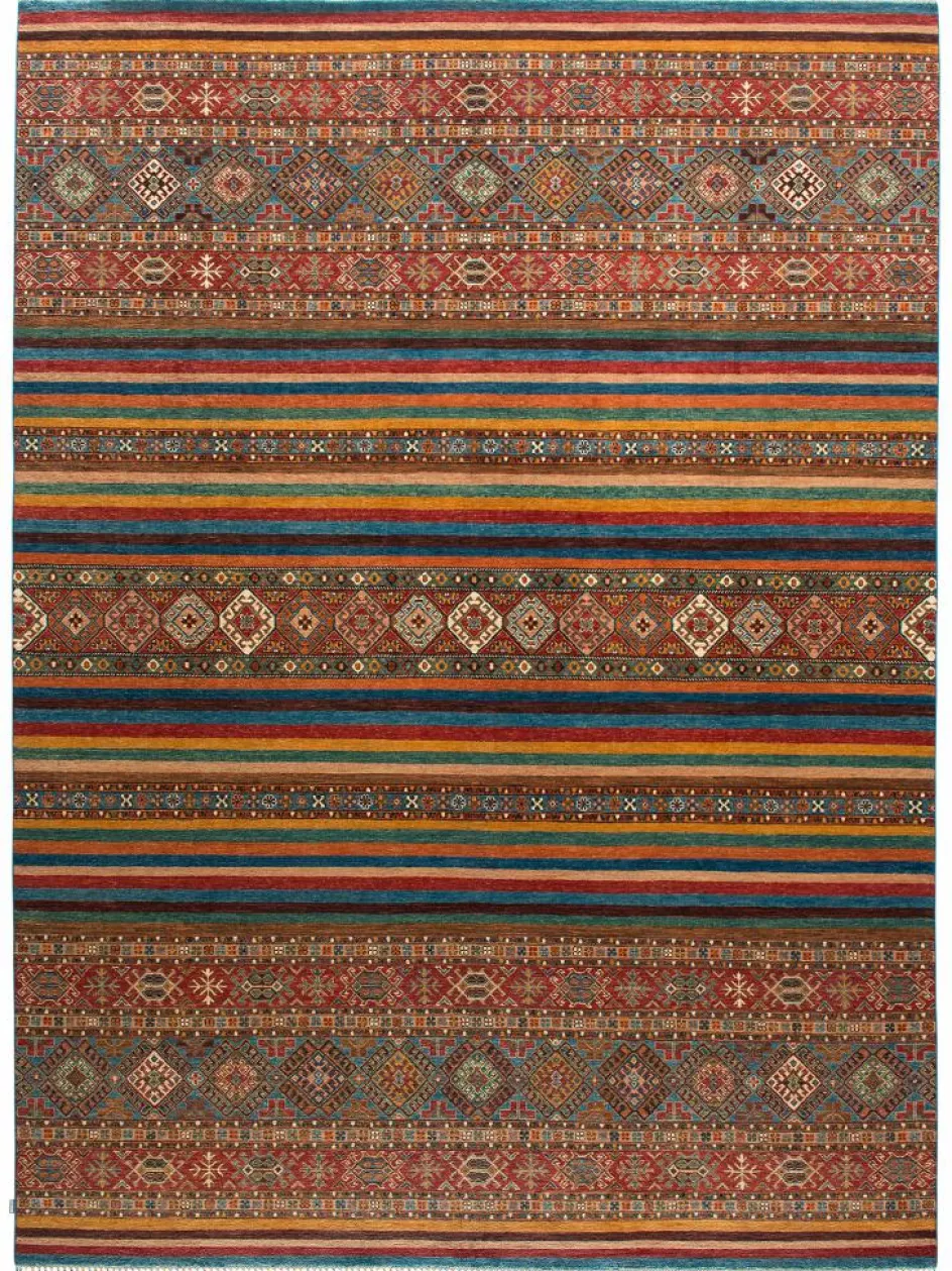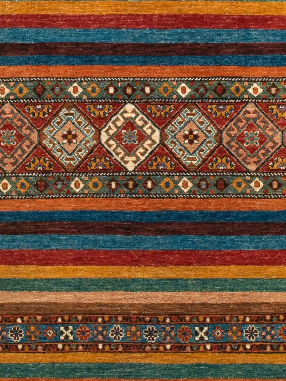 -Muster sind bunte Längsstreifen mit vielen verschiedenen Motiven gefüllt. Durch den flachen und festen Flor ist der Teppich unempfindlich gegenüber den Belastungen des Alltags.- Das Besondere an diesemOrientteppich