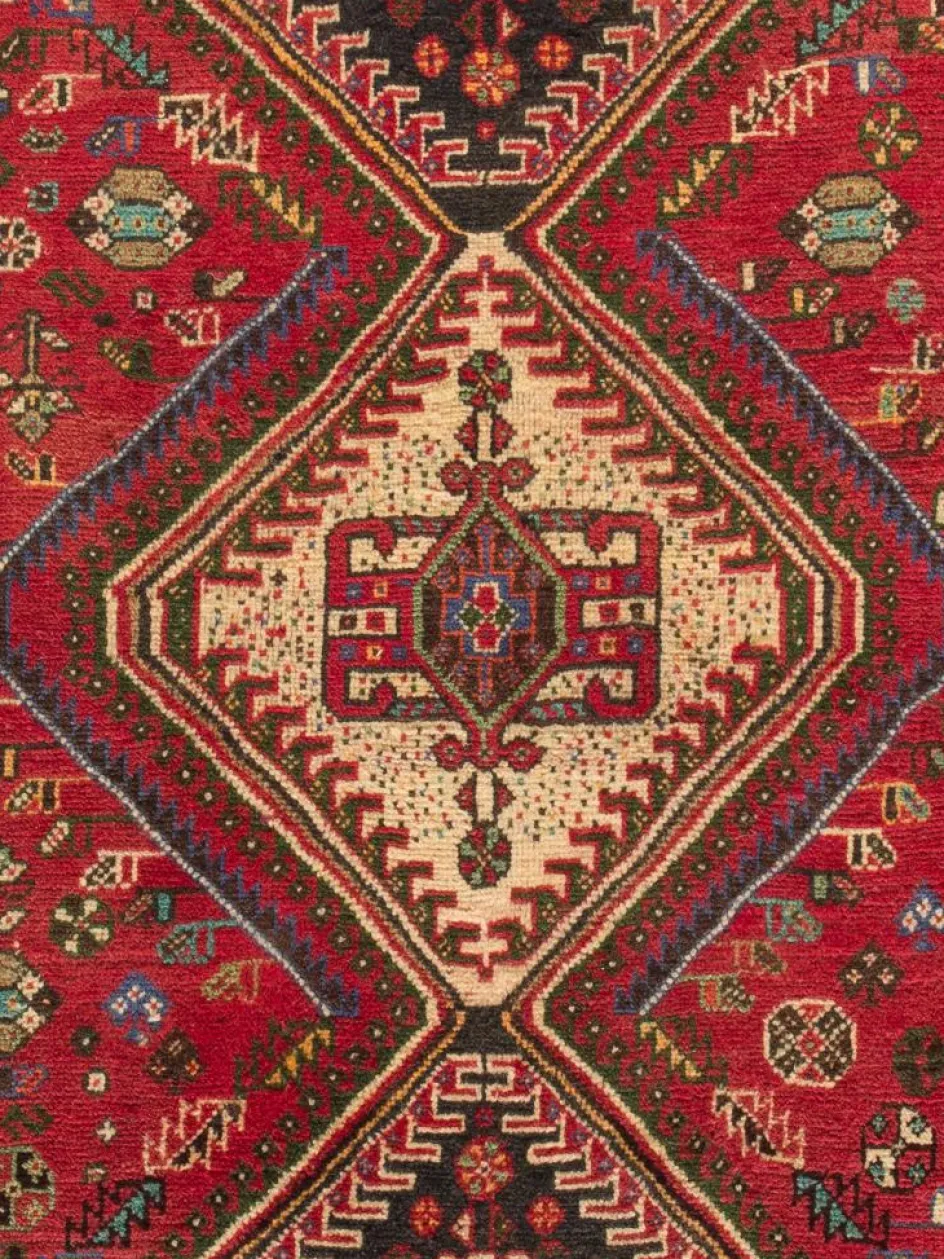 -Teppiche sind die Könige unter den Nomadenteppichen. Knüpfvorlagen gibt es bei den Ghashgai nicht. Die Knüpferinnen haben ein sehr gutes Gedächtnis. Sie brauchen ein interessantes Motiv nur einmal zu sehen oder erzählt zu bekommen. Alle Teppiche werden aus dem Gedächtnis geknüpft und sind daher nie gleich. Die Ornamente werden immer anders angeordnet oder die Farben unterscheiden sich. DasGrundgewebe