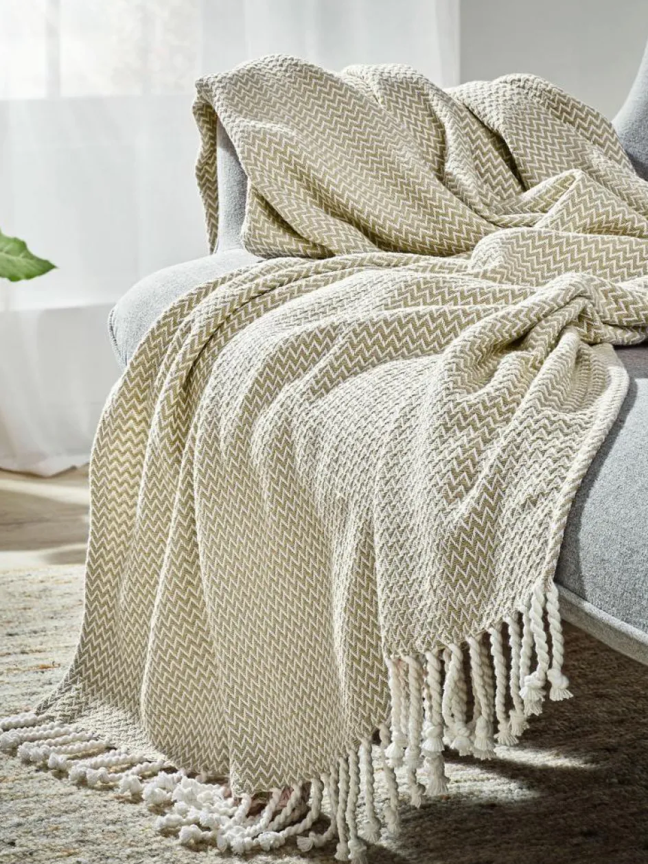 reiner Baumwolle gefertigt. Der hohe Materialeinsatz dieses feinen Jaquard-Gewebes bietet Wärme und lange Haltbarkeit. Zum pfiffigen Abschluss haben wir die JENSON-Decke mit Kordeln versehen. Oeko-Text Standard 100.
