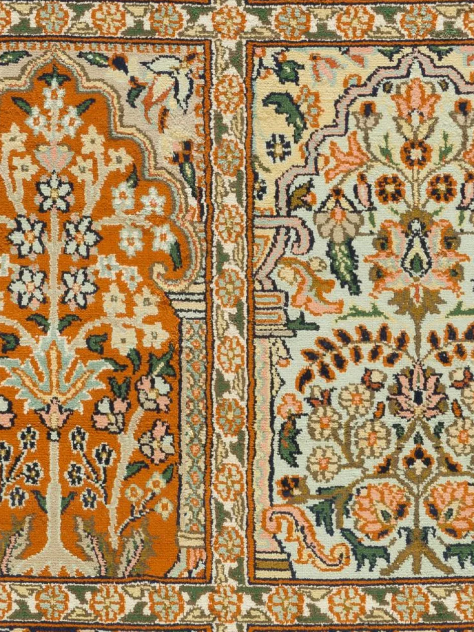 -Teppiche sind eher zurückhaltend, die Muster nach wie vor sehr stark persisch beeinflusst. Florale Motive und das persischeFeldermuster