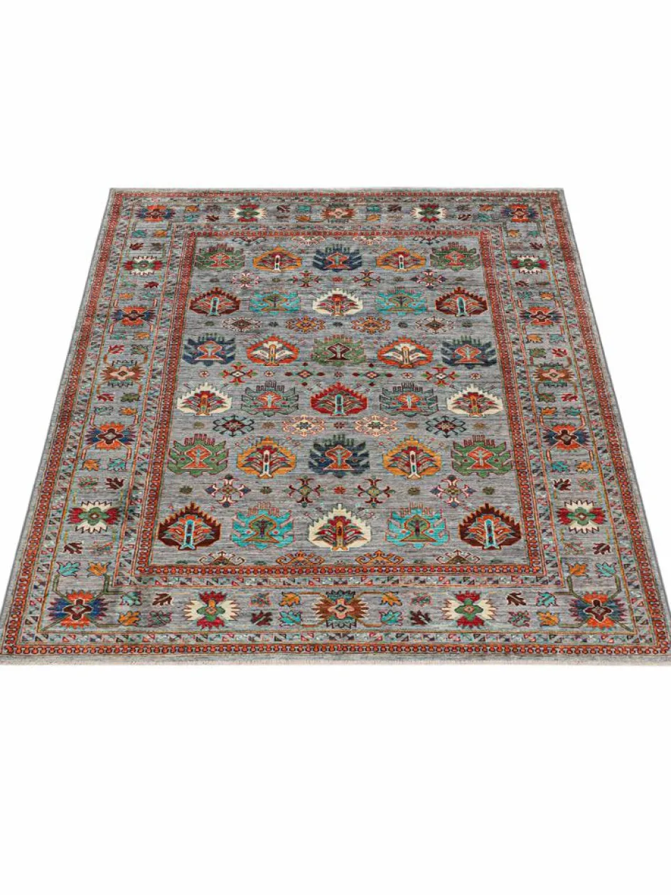 , einem klassischen Blütenmuster. Das Wort „Phool“ kommt aus der Pakistanischen Sprache Urdu und bedeutet „“Blume““. Durch den flachen und festen Flor ist der Teppich unempfindlich gegenüber den Belastungen des Alltags. – Der Teppich wurde ausGhazni