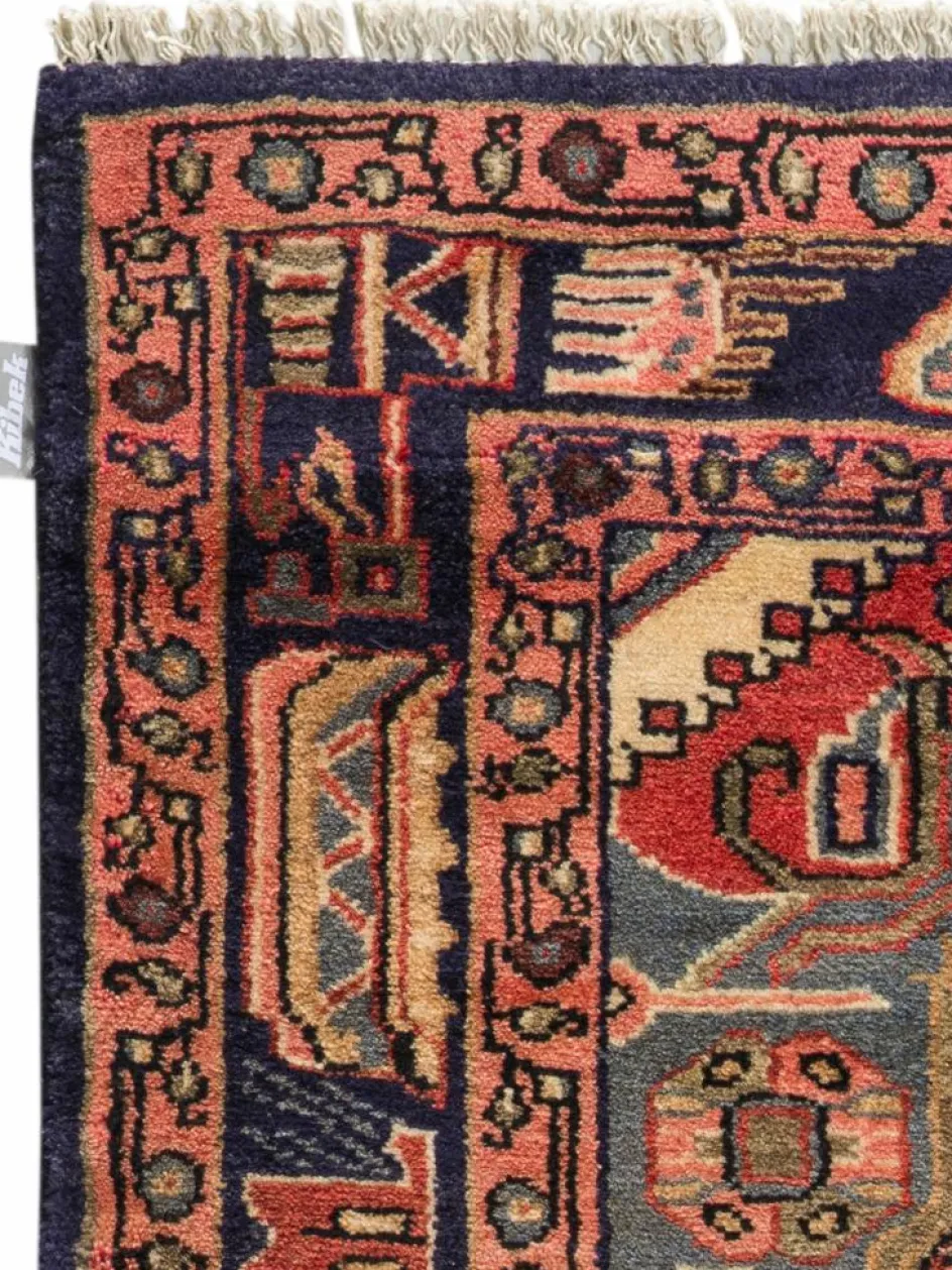 finden sich die unterschiedlichsten Dessins anderer Provenienzen, die in einer kurdentypischen Art und Weise, in völlig anderen Farben, geknüpft werden. Meist ist die Farbgebung der Teppiche eher dunkel. Der hohe Flor ist aus guter Bergschafwolle und besonders haltbar.| Gesamthöhe: | ca. 12 mm |