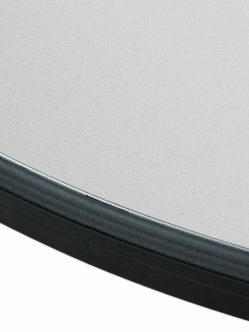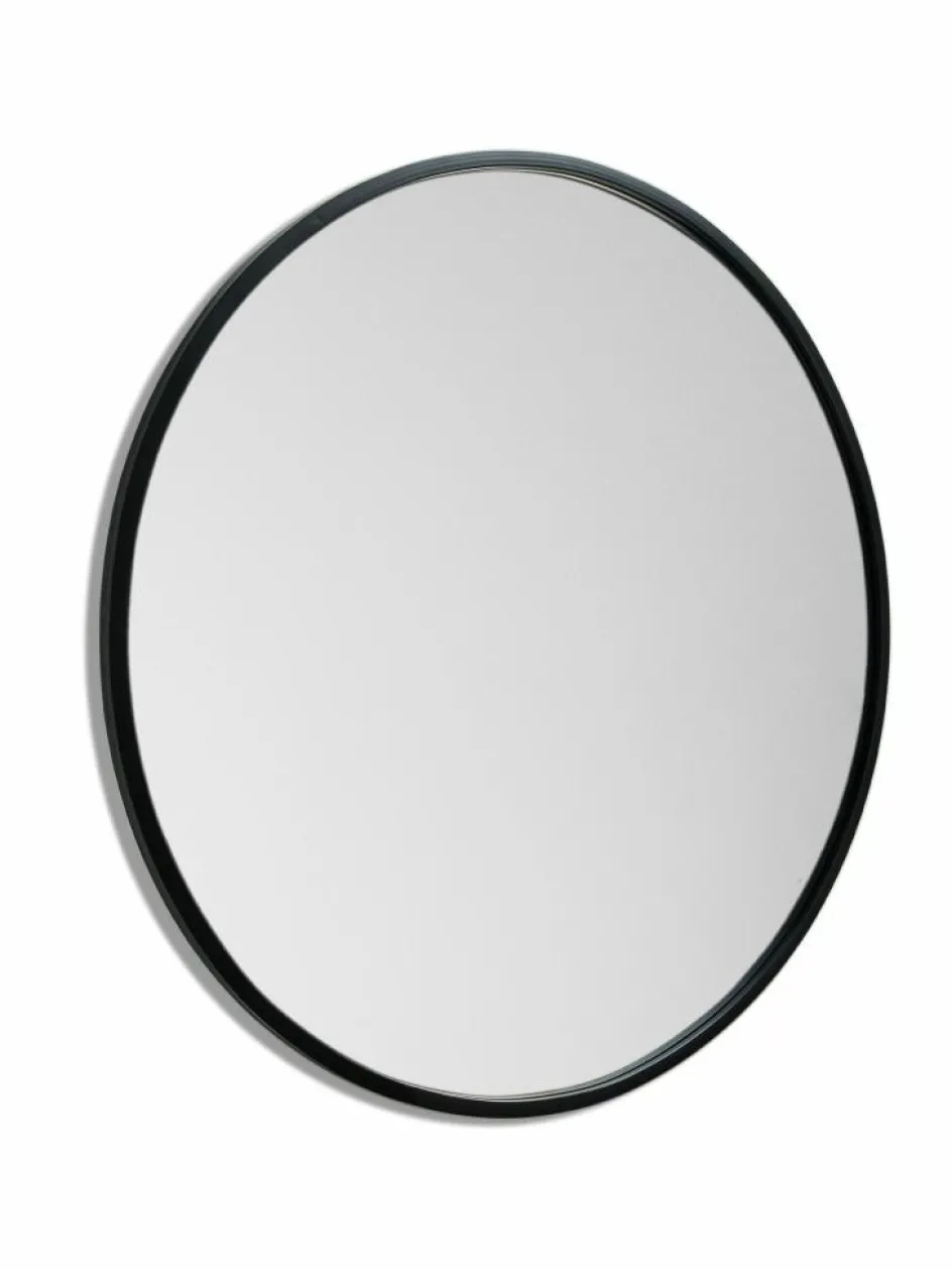 Runder Wandspiegel mit Aufhängung in schwarzem Metallrahmen.