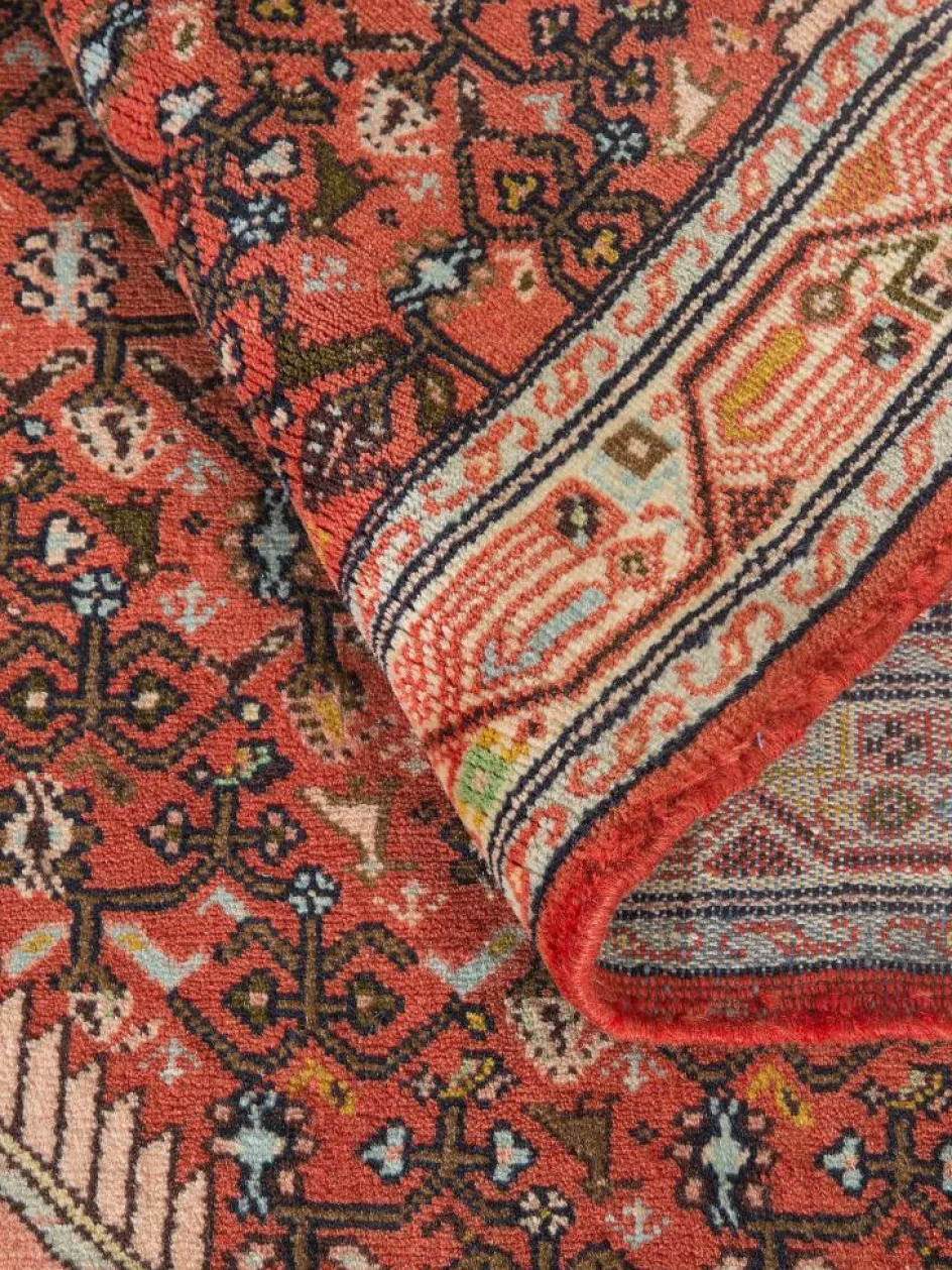 . Die Farben des Teppichs sind warm. Die Muster sind charakteristisch: Das Innenfeld ist mit einemMahi