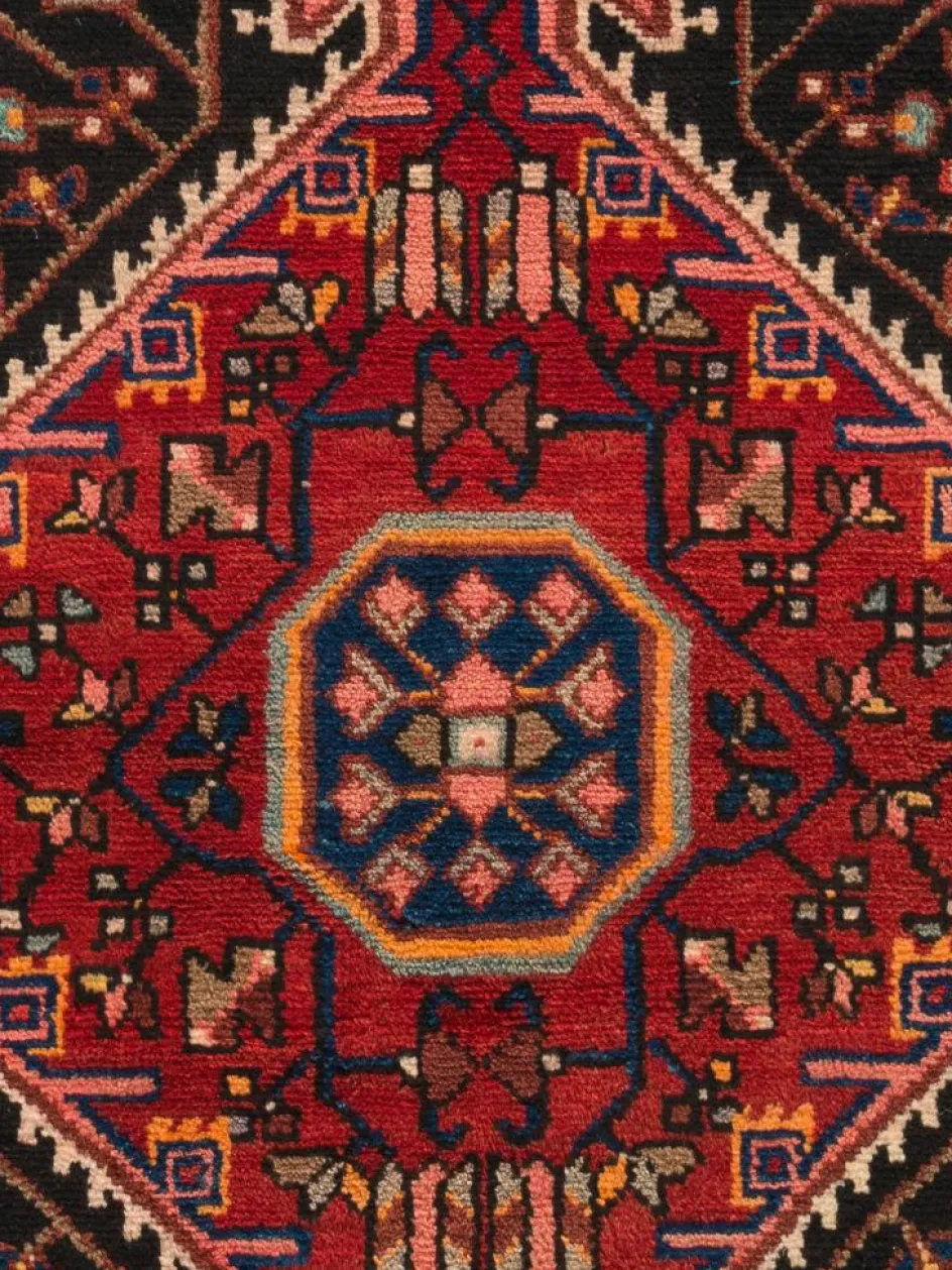 -Gebiets. Hier werden robuste Teppiche geknüpft. Charakteristisch ist ein beigefarbener oder schwarzer Grund, wenig gemustert, von dem sich das typische hexagonale Mittelmedaillon stark abhebt.- Die Gegend umHamadan